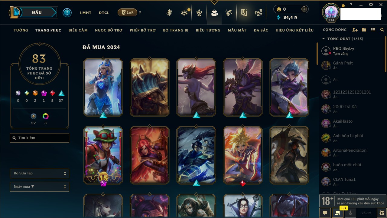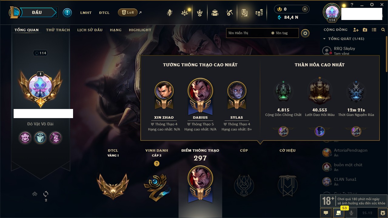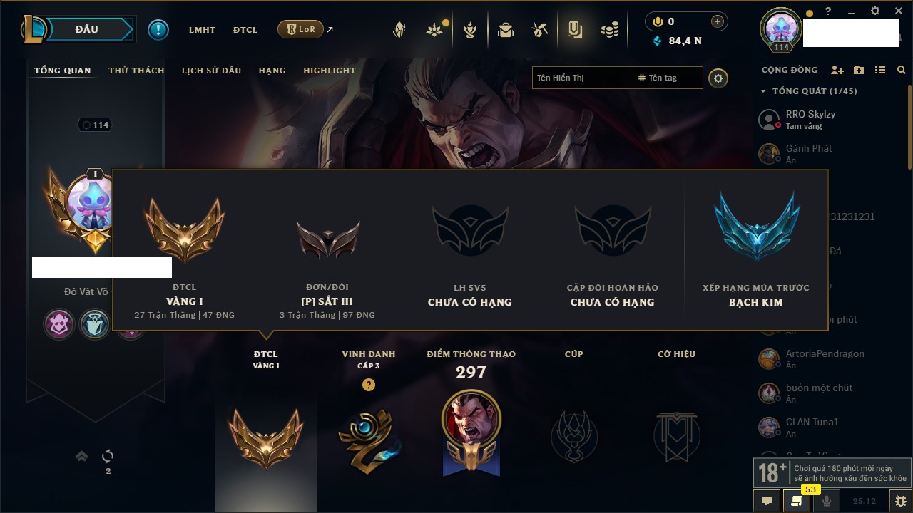 Rank Đơn: Chưa RankKhung: Bạch kimTướng: 172 - Còn 179290 THXTrang Phục: 187Rank ĐTCL: Chưa RankLinh Thú: 49