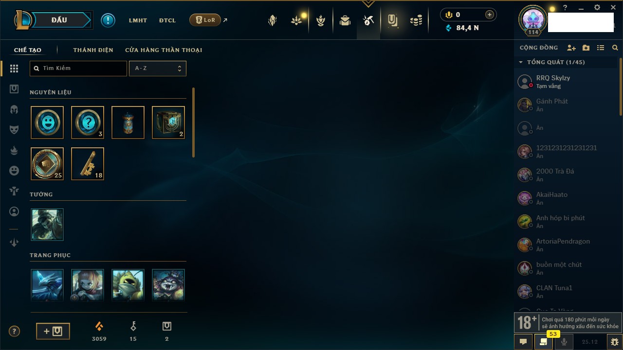 Rank Đơn: Chưa RankKhung: Chưa có khungTướng: 171 - Còn 164047 THXTrang Phục: 173Rank ĐTCL: Chưa RankLinh Thú: 77