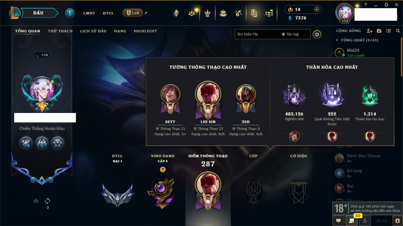Rank Đơn: Vàng IV Khung: Vàng Tướng: 172 - Còn 43905 THX Trang Phục: 106 Rank ĐTCL: Bạc II Linh Thú: 62