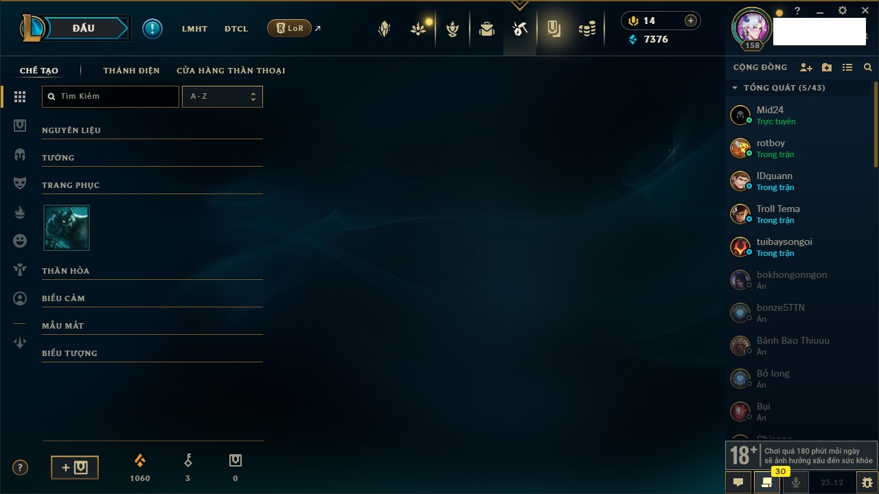 Rank Đơn: Đồng IV Khung: Chưa có khung Tướng: 171 - Còn 88838 THX Trang Phục: 103 Rank ĐTCL: Vàng IV Linh Thú: 139