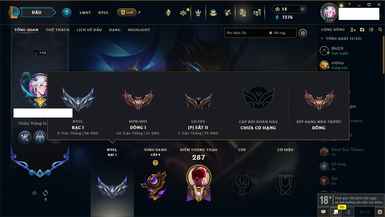 Rank Đơn: Đồng I Khung: Đồng Tướng: 170 - Còn 7376 THX Trang Phục: 137 Rank ĐTCL: Chưa Rank Linh Thú: 132