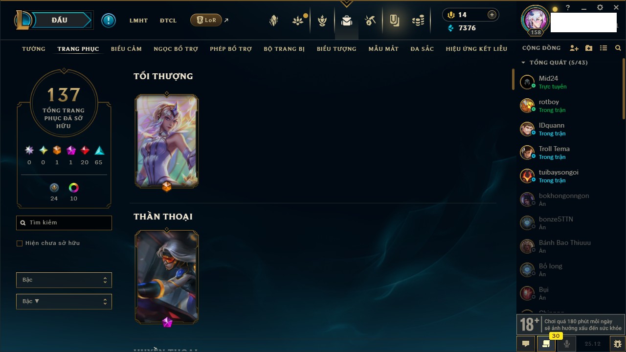 Rank Đơn: Vàng I Khung: Vàng Tướng: 155 - Còn 18217 THX Trang Phục: 63 Rank ĐTCL: Chưa Rank Linh Thú: 49