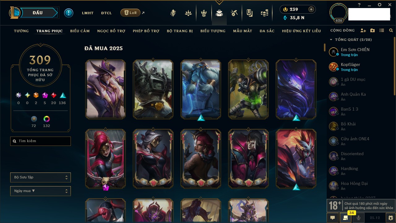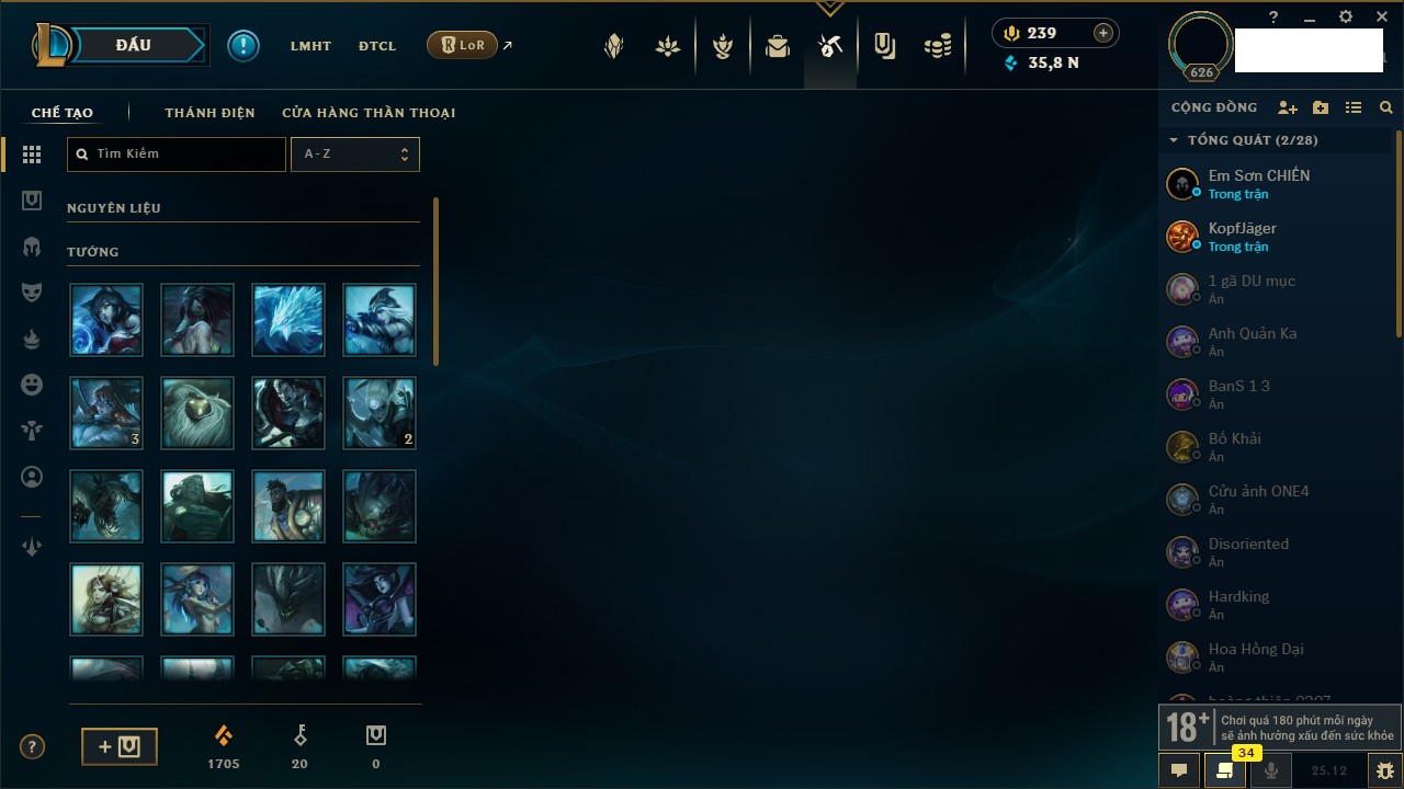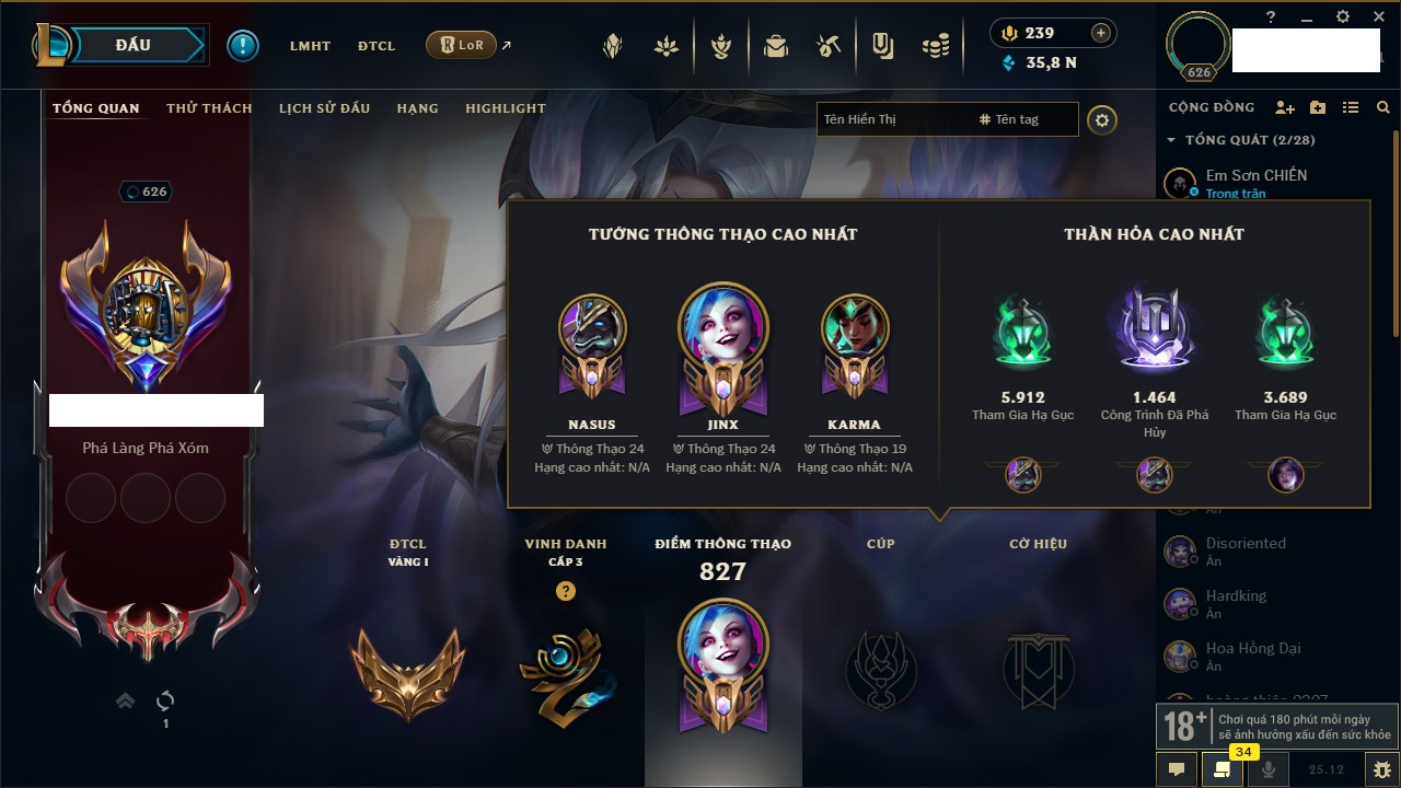 Rank Đơn: Chưa RankKhung: Chưa có khungTướng: 171 - Còn 75227 THXTrang Phục: 425Rank ĐTCL: Chưa RankLinh Thú: 201