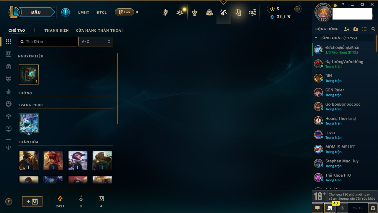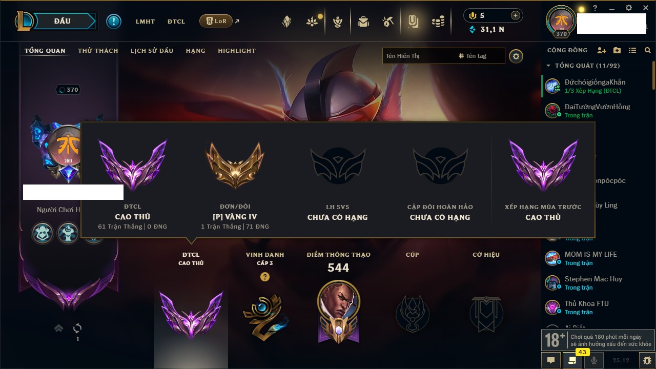 Rank Đơn: Bạch Kim IVKhung: Bạch kimTướng: 171 - Còn 154285 THXTrang Phục: 169Rank ĐTCL: Bạch Kim IILinh Thú: 60