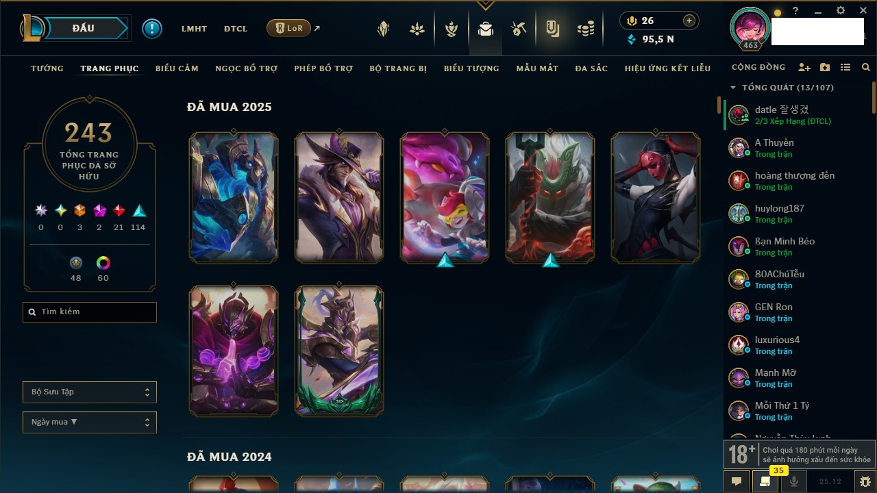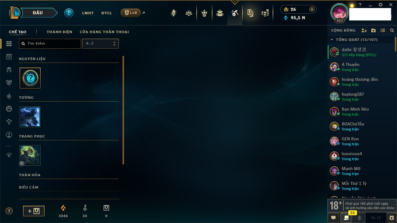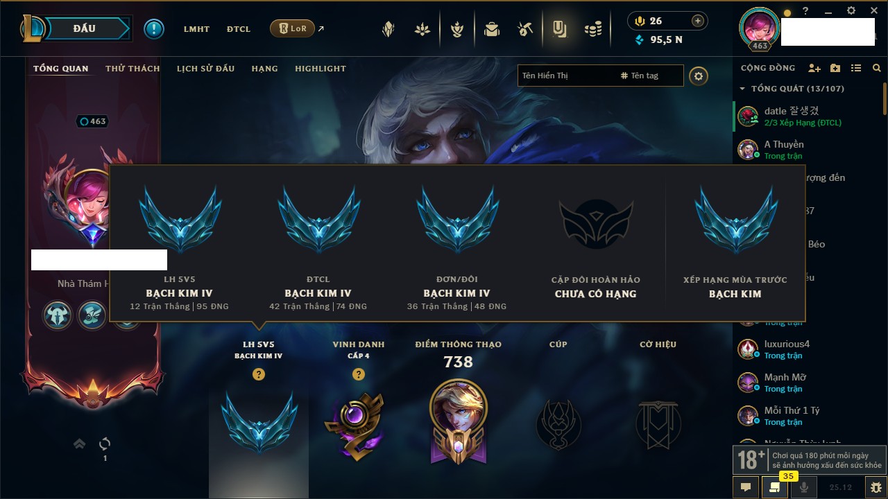 Rank Đơn: Bạch Kim IV Khung: Bạch kim Tướng: 170 - Còn 95523 THX Trang Phục: 243 Rank ĐTCL: Chưa Rank Linh Thú: 150
