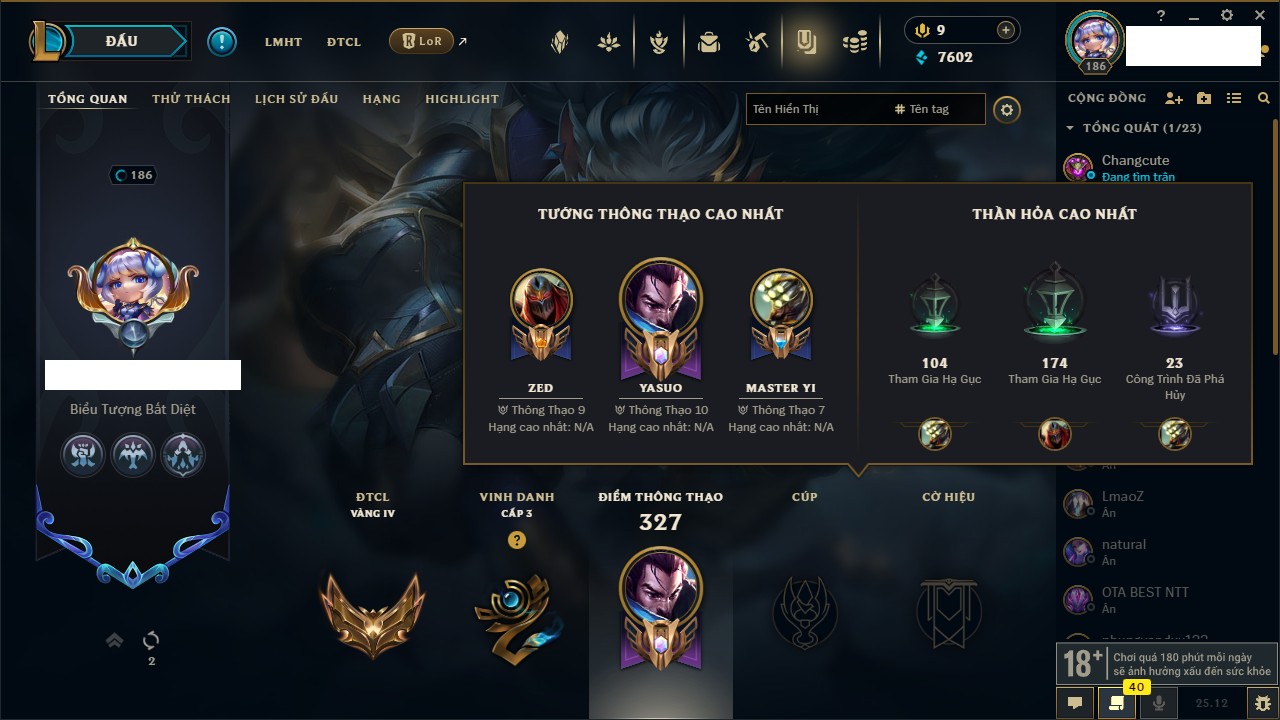 Rank Đơn: Vàng IVKhung: VàngTướng: 171 - Còn 56632 THXTrang Phục: 215Rank ĐTCL: Bạc ILinh Thú: 71