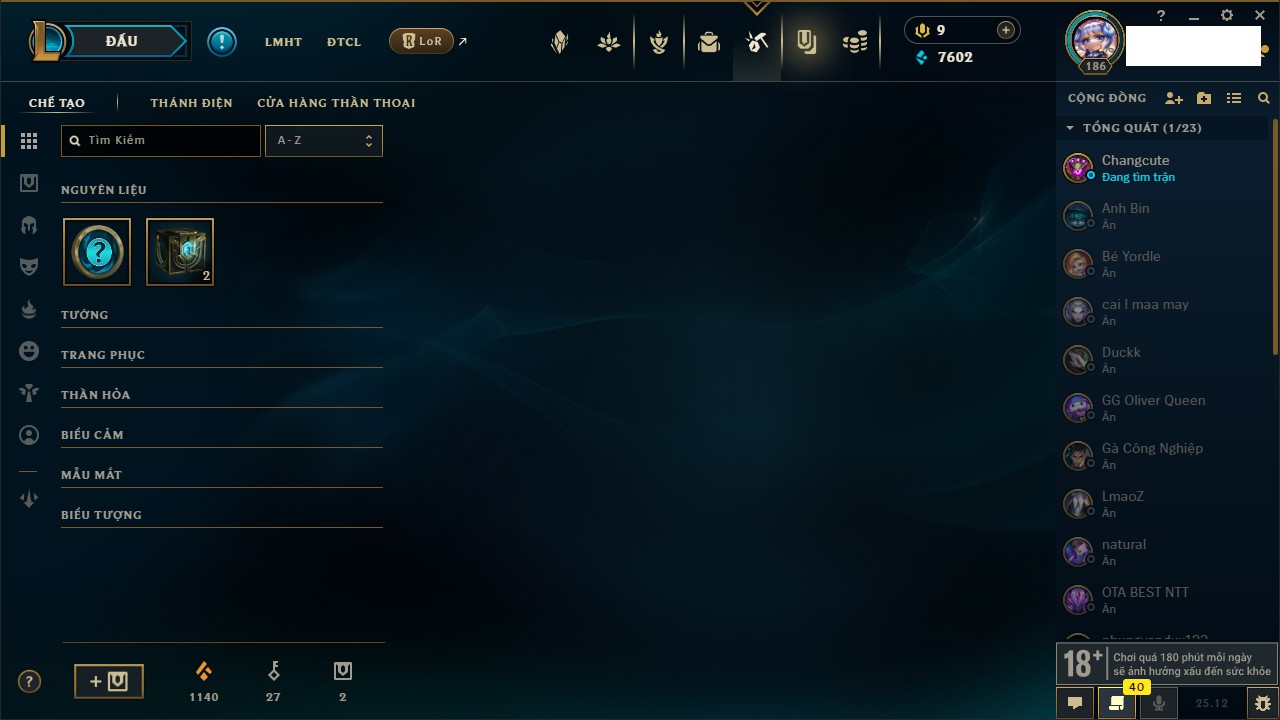 Rank Đơn: Vàng IIIKhung: BạcTướng: 171 - Còn 101359 THXTrang Phục: 88Rank ĐTCL: Kim Cương IVLinh Thú: 200
