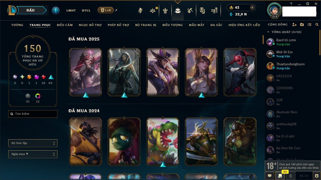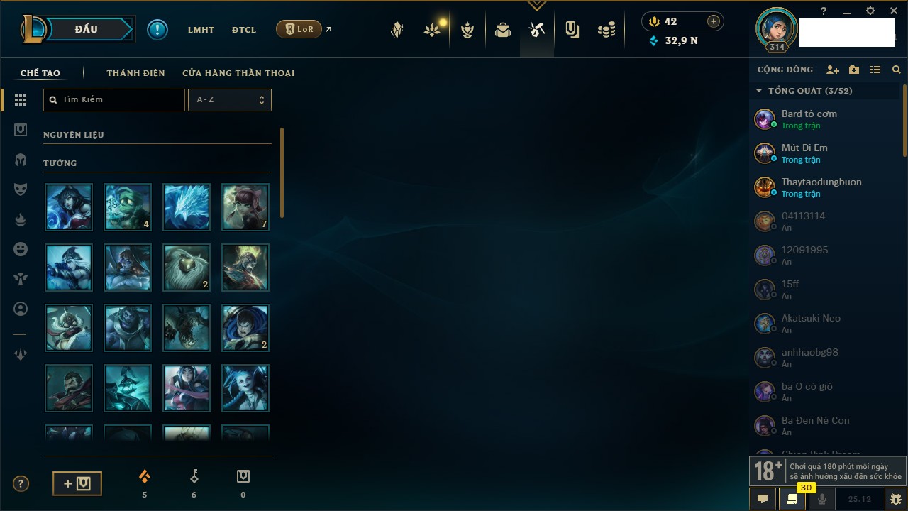 Rank Đơn: Đồng IIIKhung: Chưa có khungTướng: 152 - Còn 6423 THXTrang Phục: 160Rank ĐTCL: Chưa RankLinh Thú: 107