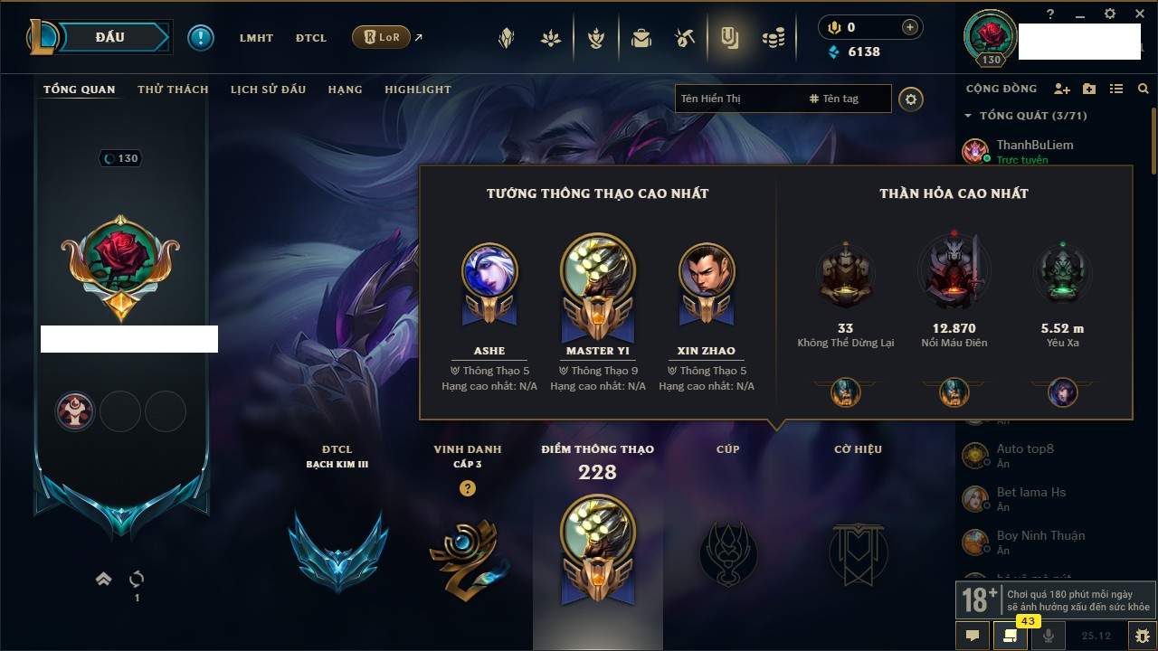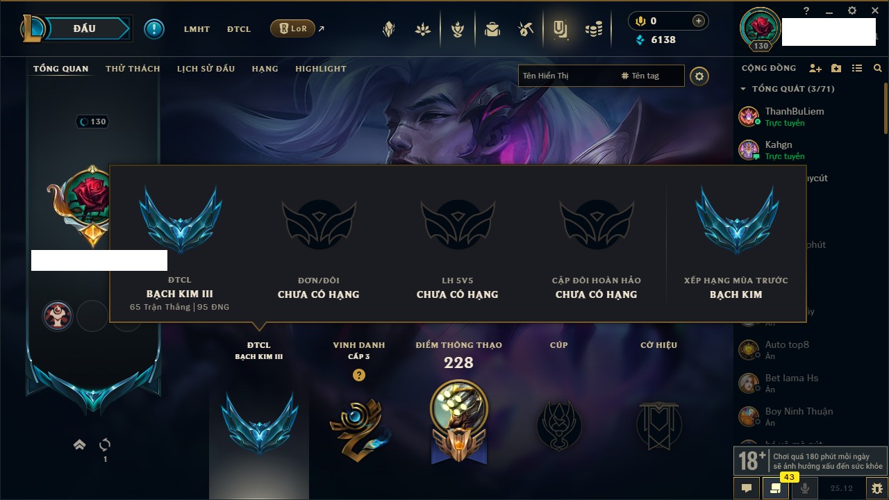 Rank Đơn: Chưa RankKhung: Bạch kimTướng: 172 - Còn 81 THXTrang Phục: 226Rank ĐTCL: Chưa RankLinh Thú: 193