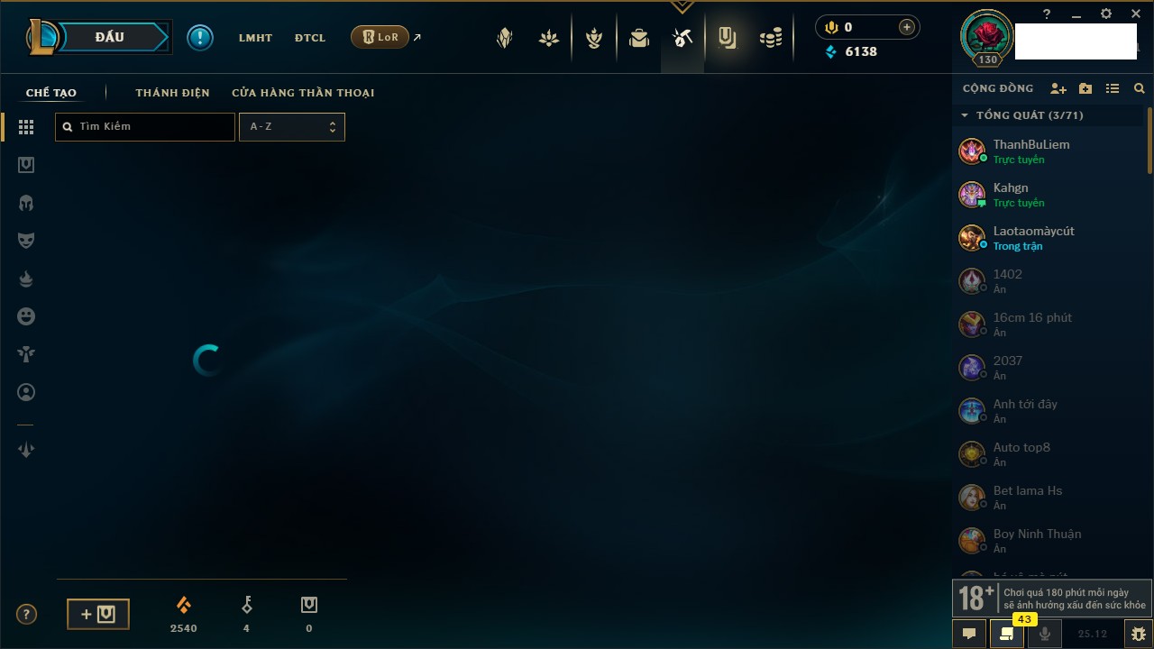 Rank Đơn: Chưa RankKhung: Chưa có khungTướng: 172 - Còn 124206 THXTrang Phục: 232Rank ĐTCL: Chưa RankLinh Thú: 112