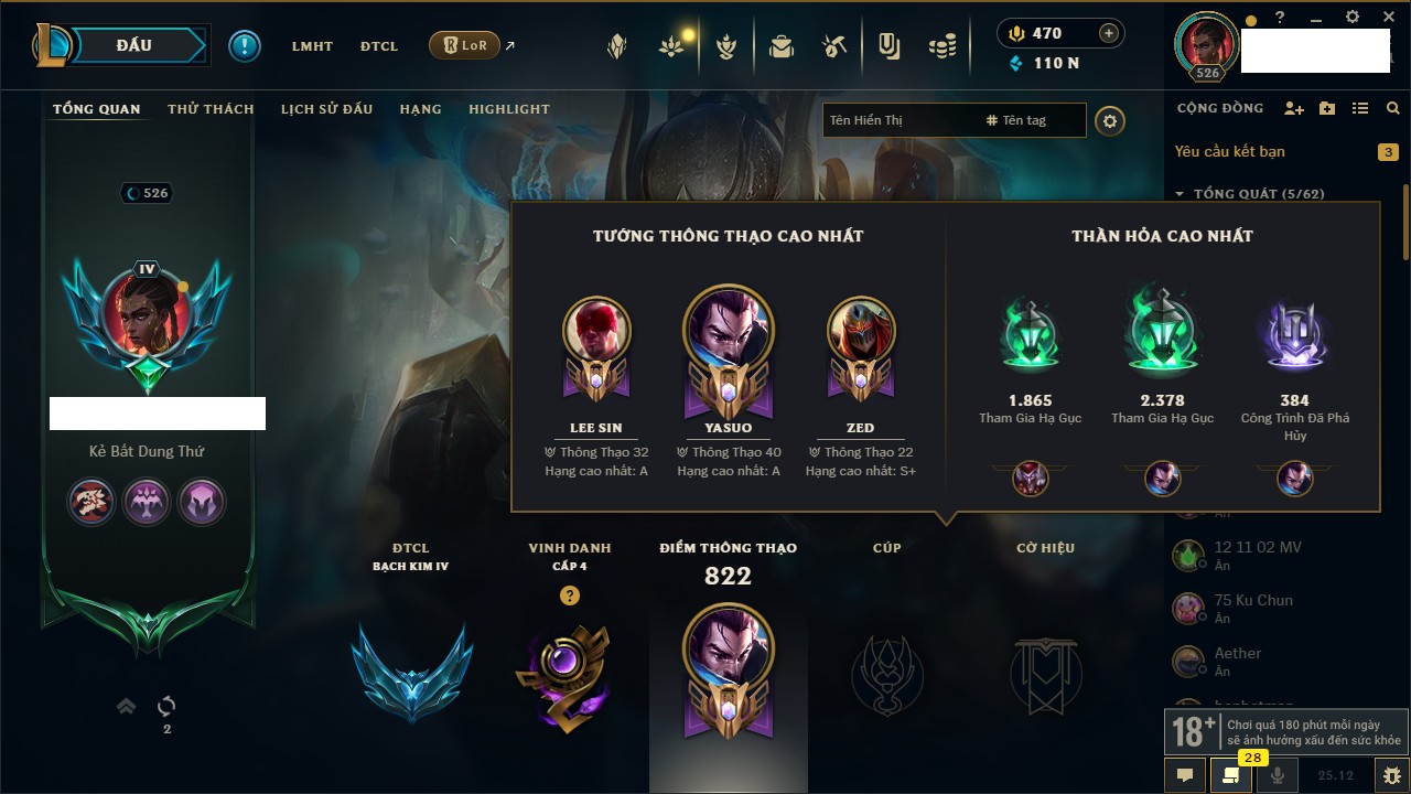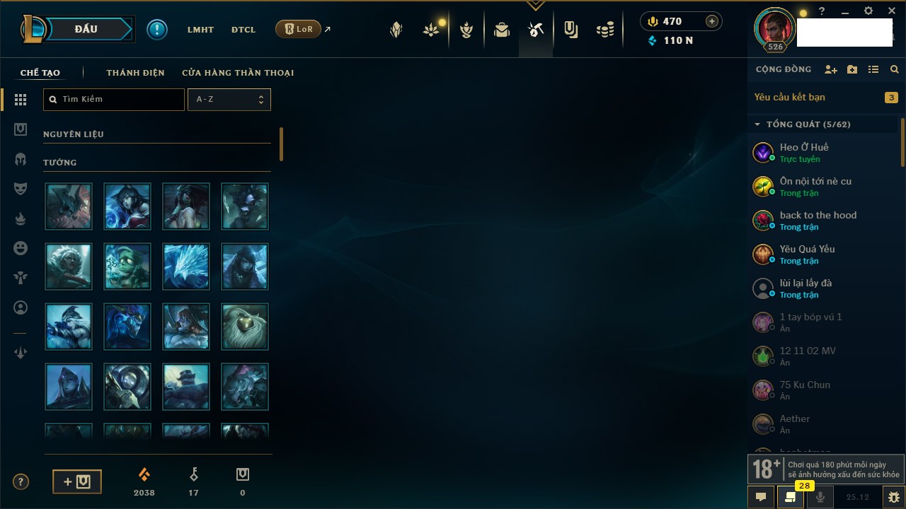 Rank Đơn: Sắt IVKhung: SắtTướng: 161 - Còn 107294 THXTrang Phục: 86Rank ĐTCL: Vàng ILinh Thú: 204