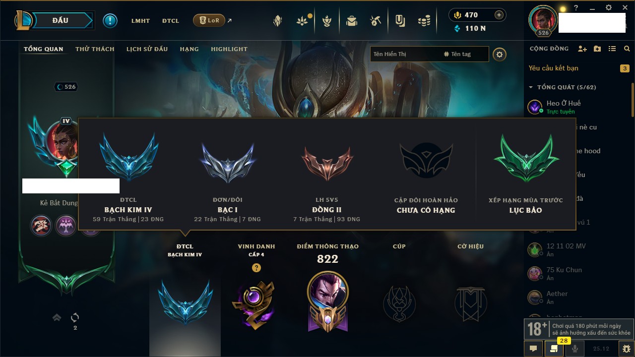 Rank Đơn: Đồng IIKhung: ĐồngTướng: 171 - Còn 83342 THXTrang Phục: 94Rank ĐTCL: Bạch Kim IVLinh Thú: 161