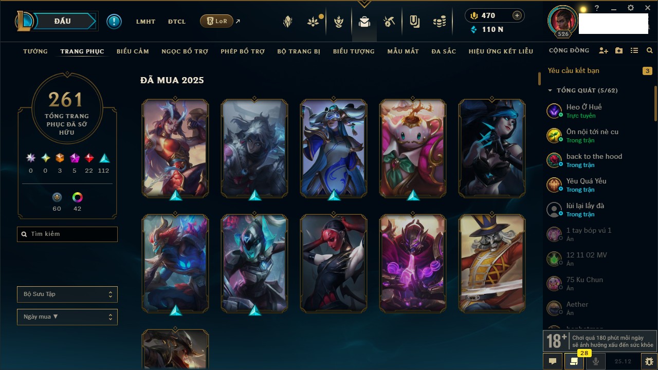 Rank Đơn: Vàng IIIKhung: VàngTướng: 171 - Còn 88128 THXTrang Phục: 329Rank ĐTCL: Chưa RankLinh Thú: 41