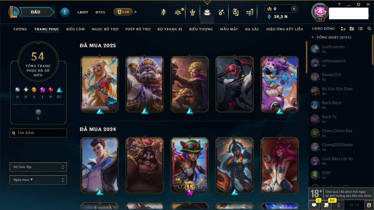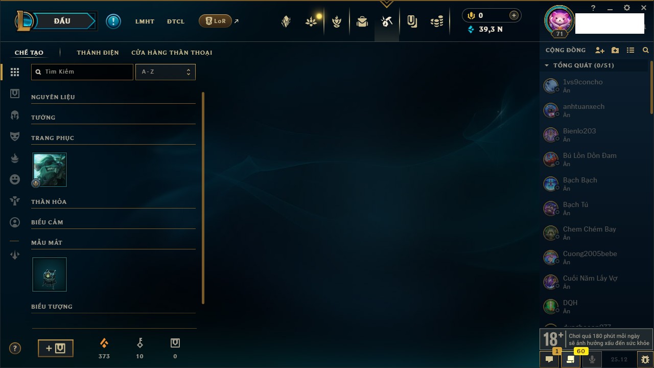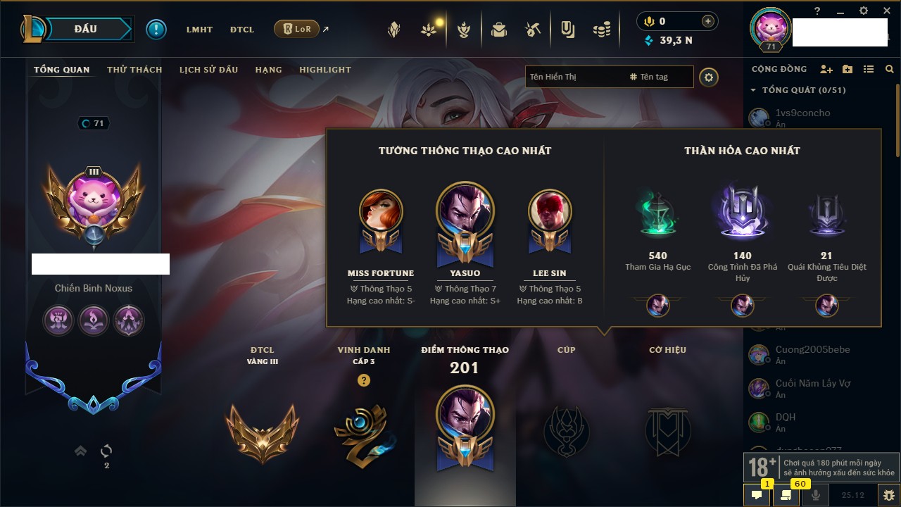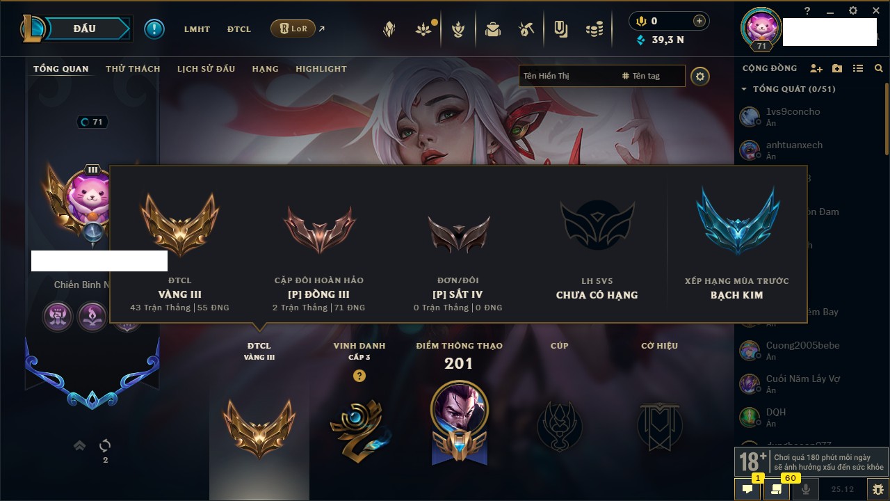 Rank Đơn: Vàng IIIKhung: BạcTướng: 171 - Còn 101359 THXTrang Phục: 88Rank ĐTCL: Kim Cương IVLinh Thú: 200