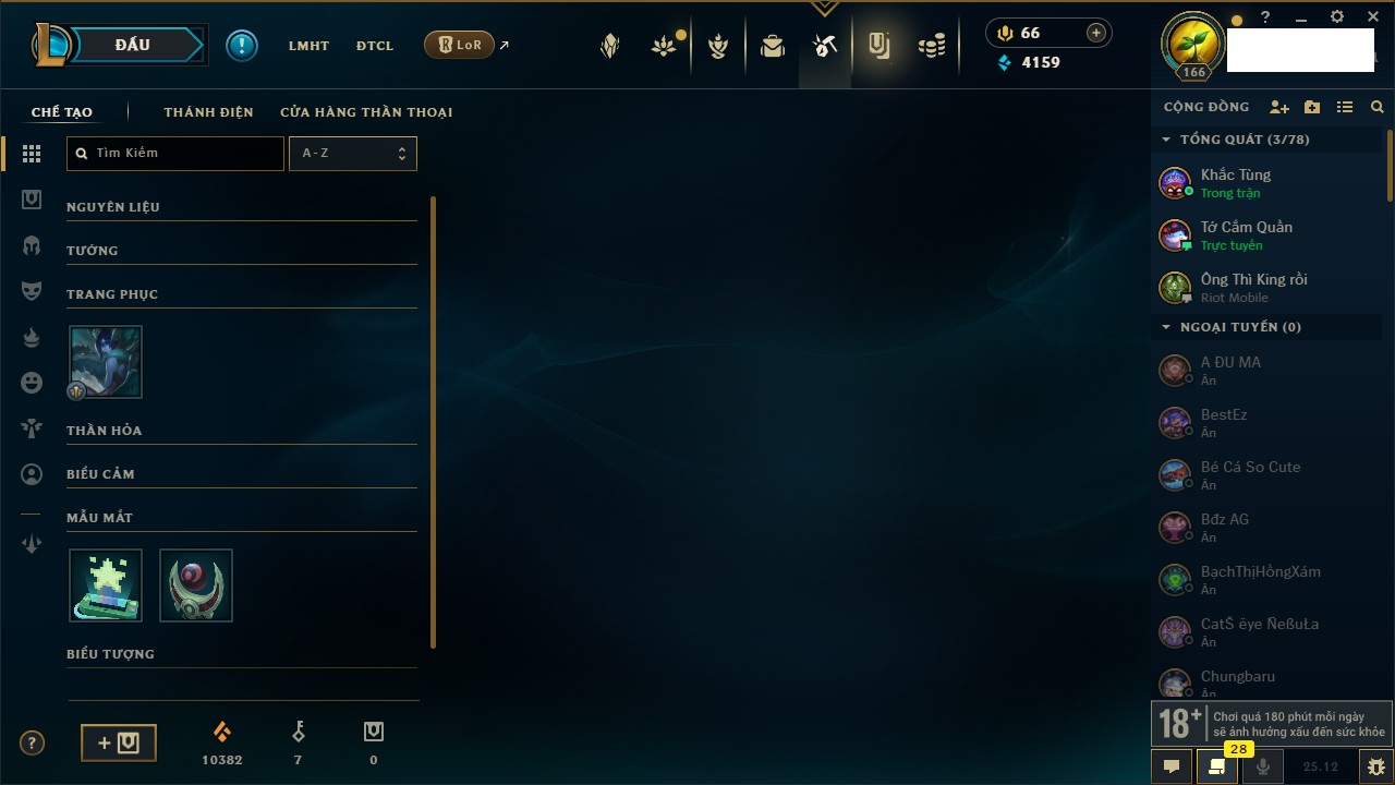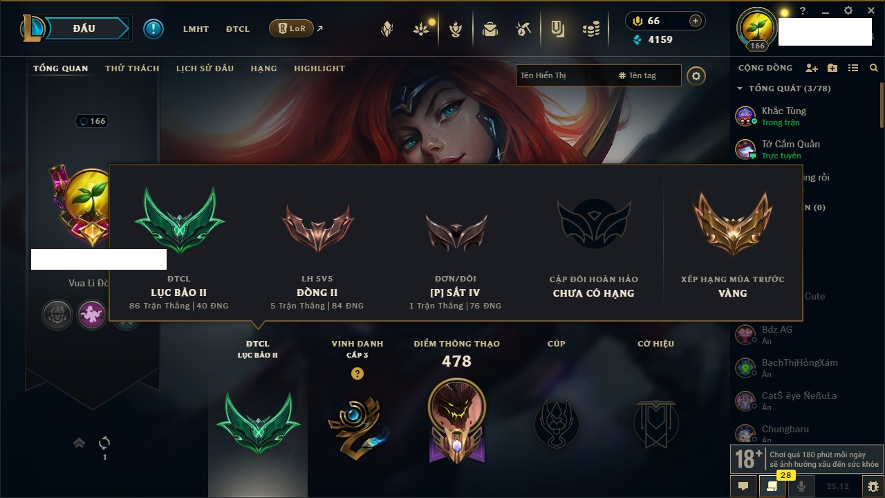 Rank Đơn: Bạc IVKhung: BạcTướng: 170 - Còn 298979 THXTrang Phục: 138Rank ĐTCL: Vàng IILinh Thú: 66