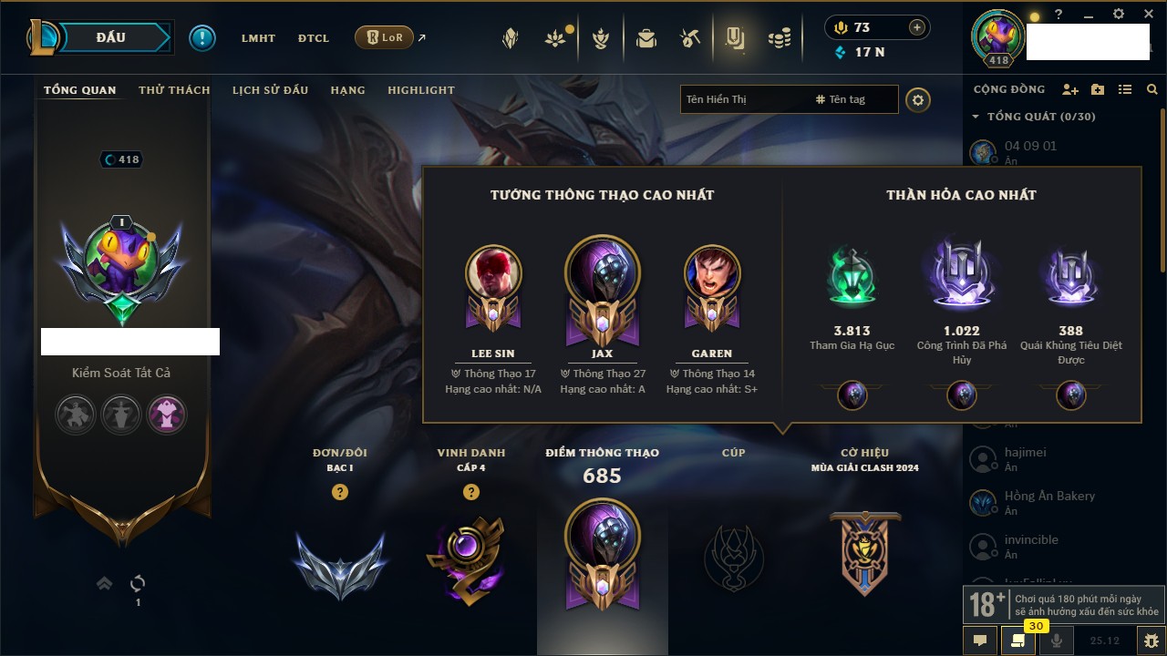 Rank Đơn: Bạch Kim IIIKhung: Bạch kimTướng: 171 - Còn 136108 THXTrang Phục: 261Rank ĐTCL: Bạc IVLinh Thú: 73