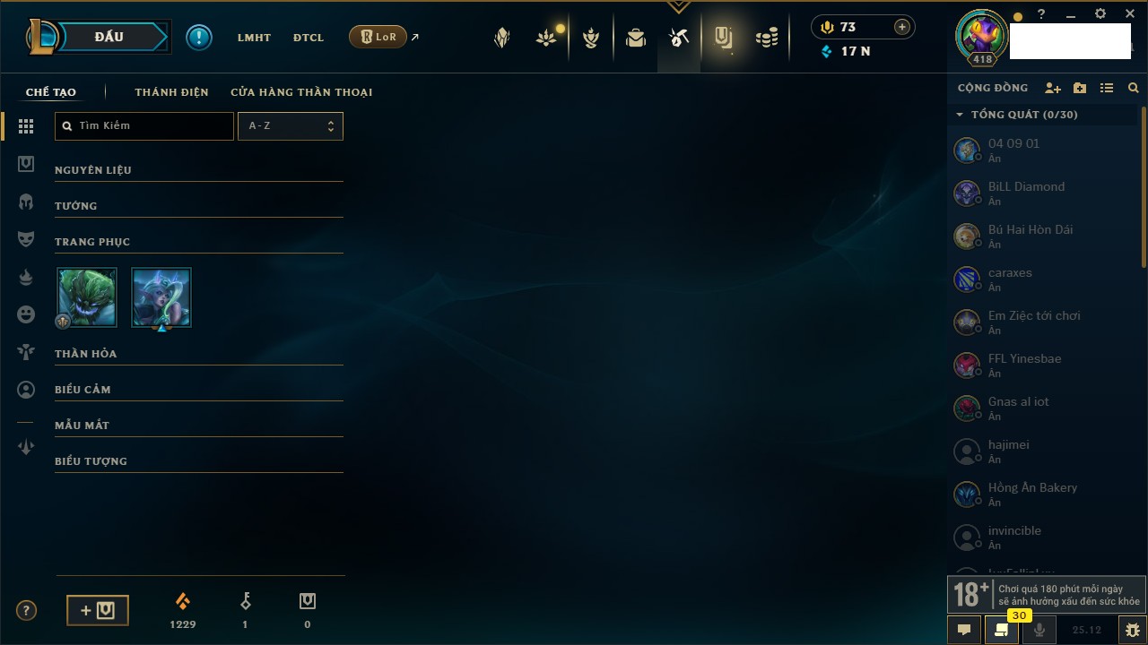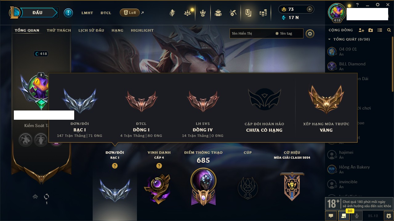 Rank Đơn: Lục Bảo IVKhung: VàngTướng: 171 - Còn 154648 THXTrang Phục: 203Rank ĐTCL: Bạch Kim IVLinh Thú: 69
