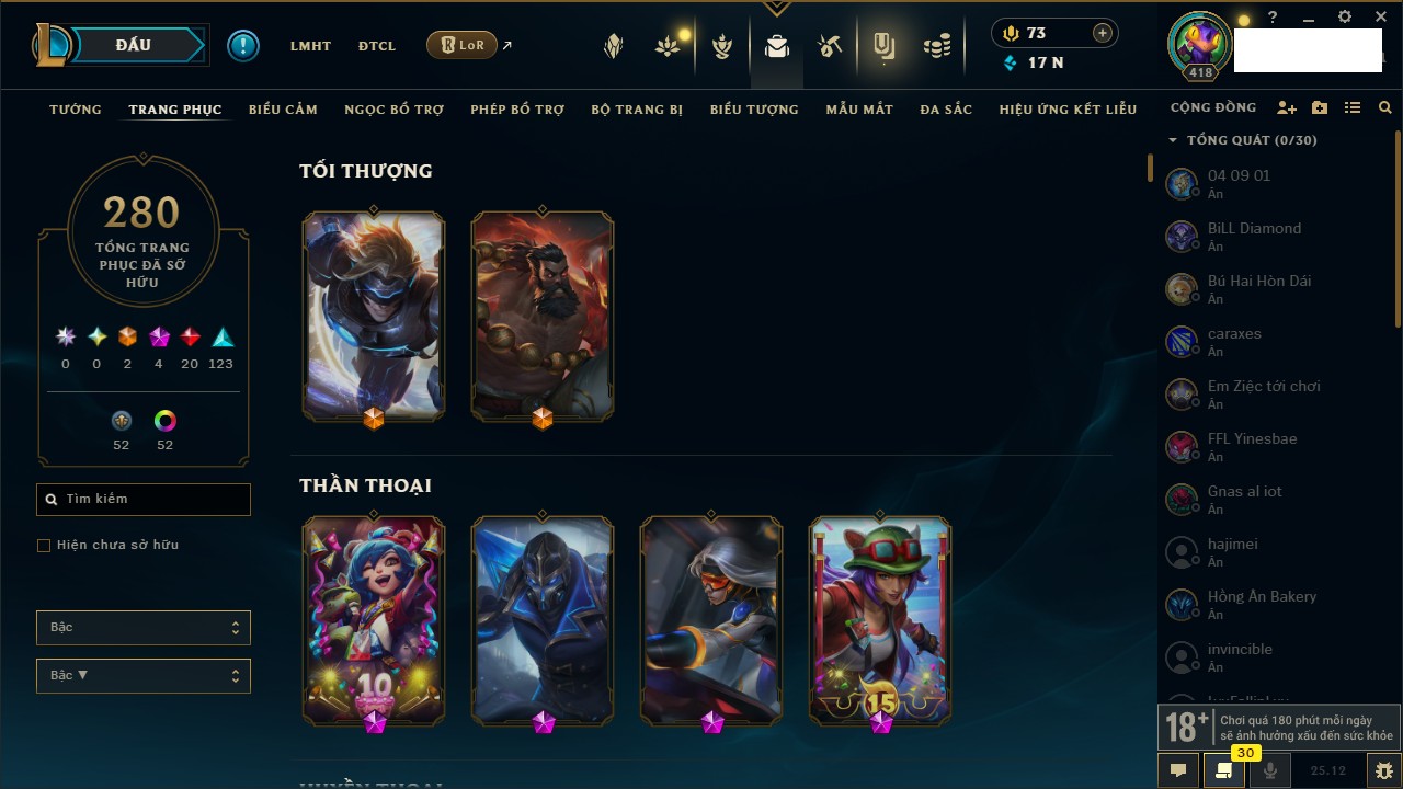 Rank Đơn: Đồng IIKhung: ĐồngTướng: 170 - Còn 95773 THXTrang Phục: 170Rank ĐTCL: Chưa RankLinh Thú: 32