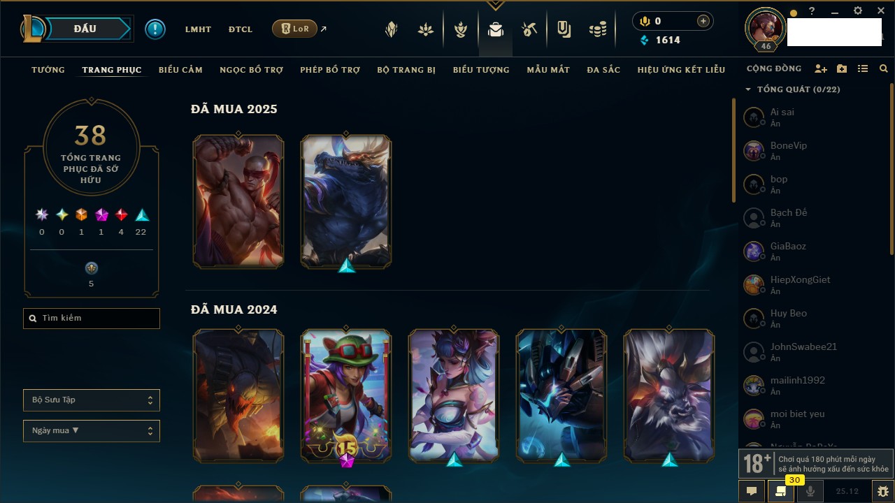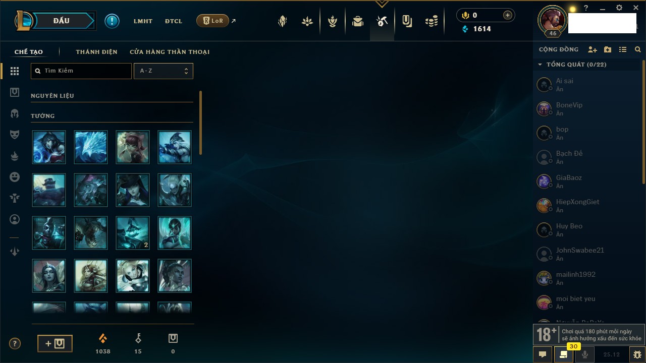 Rank Đơn: Vàng IIIKhung: BạcTướng: 171 - Còn 101359 THXTrang Phục: 88Rank ĐTCL: Kim Cương IVLinh Thú: 200