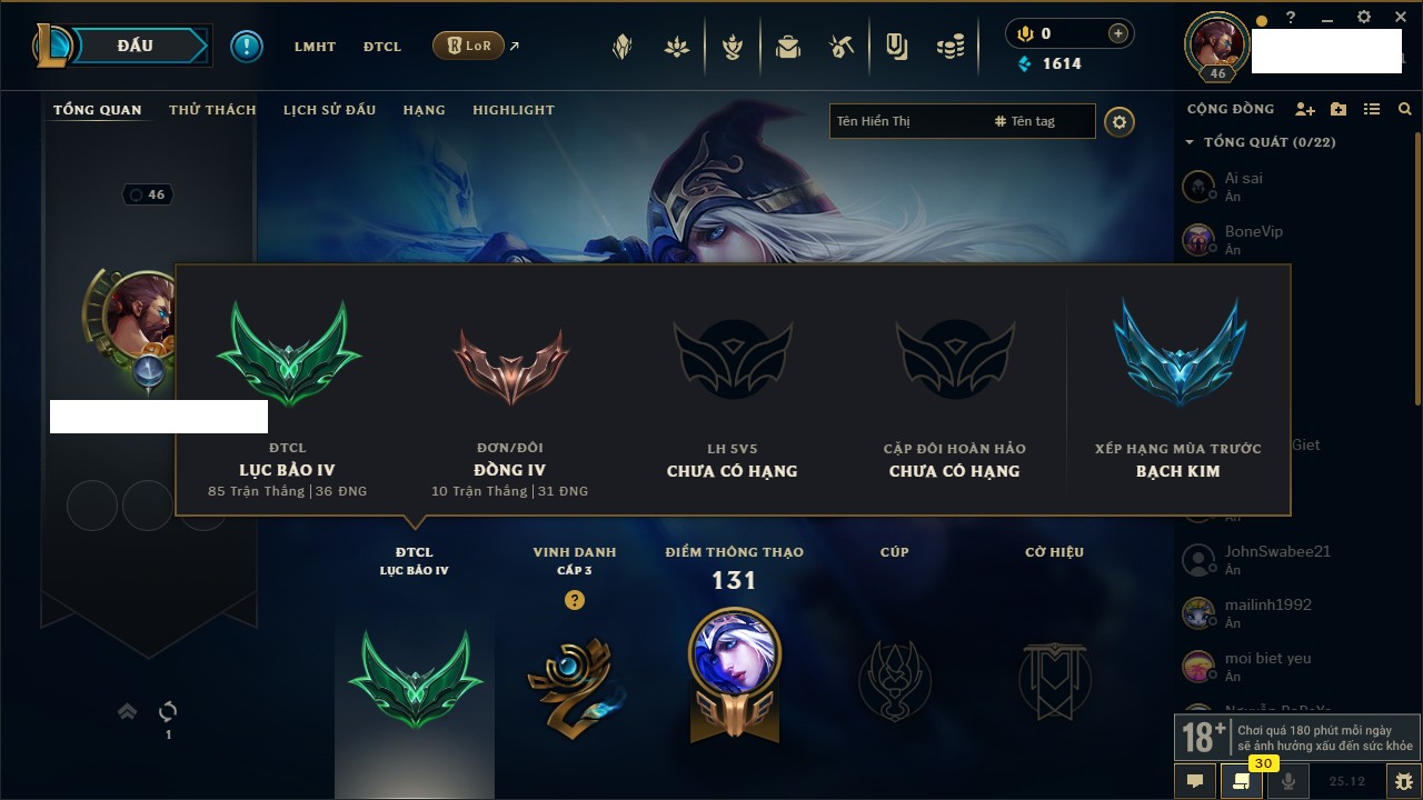 Rank Đơn: Lục Bảo IVKhung: Bạch kimTướng: 171 - Còn 128452 THXTrang Phục: 193Rank ĐTCL: Bạc IIILinh Thú: 100