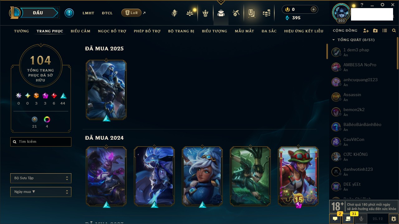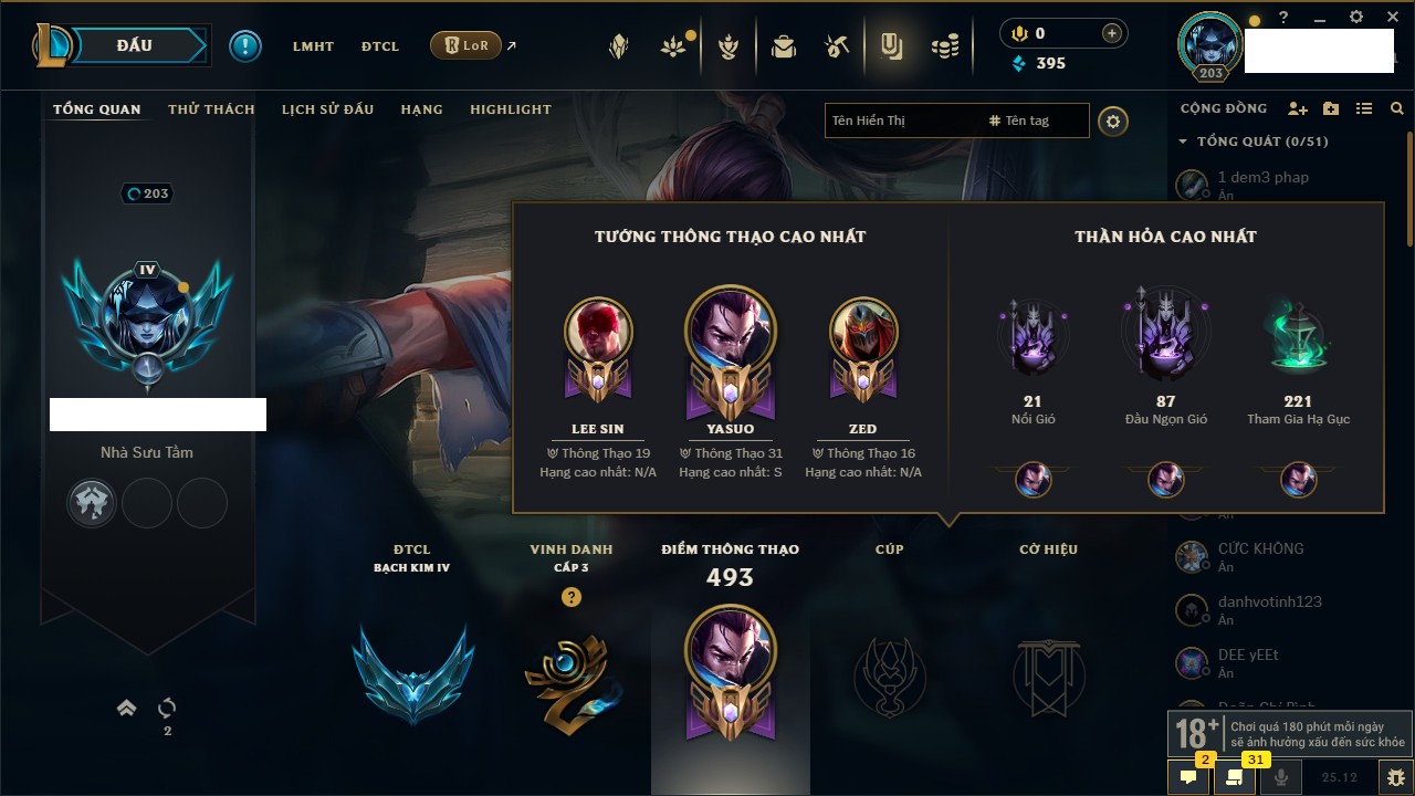 Rank Đơn: Đồng IIKhung: Chưa có khungTướng: 170 - Còn 56487 THXTrang Phục: 90Rank ĐTCL: Chưa RankLinh Thú: 129