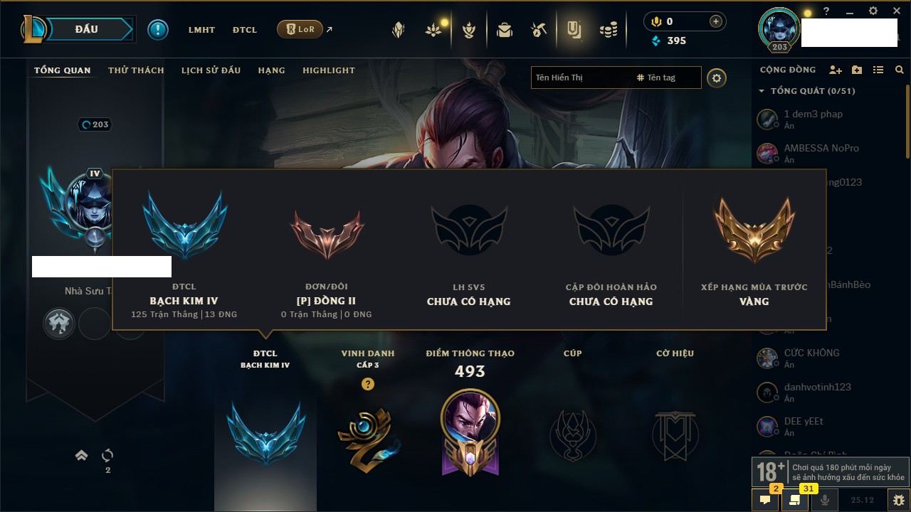 Rank Đơn: Đồng IIIKhung: ĐồngTướng: 171 - Còn 54778 THXTrang Phục: 96Rank ĐTCL: Bạch Kim IIILinh Thú: 140