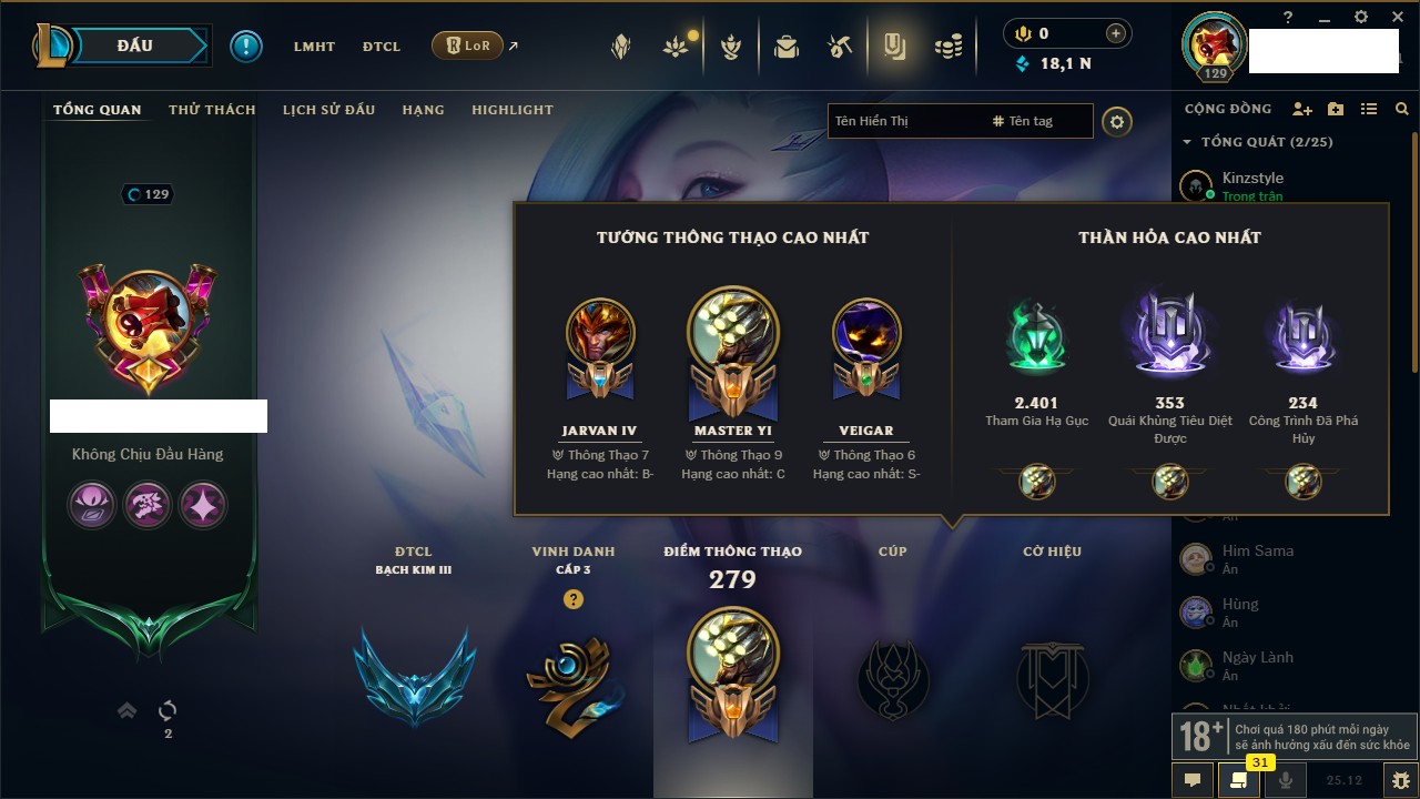 Rank Đơn: Chưa RankKhung: Chưa có khungTướng: 157 - Còn 6783 THXTrang Phục: 50Rank ĐTCL: Chưa RankLinh Thú: 37