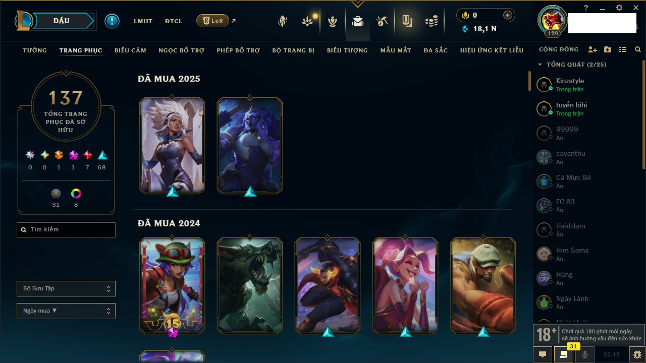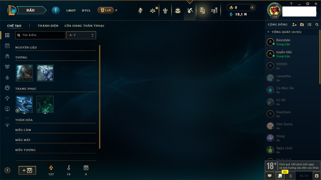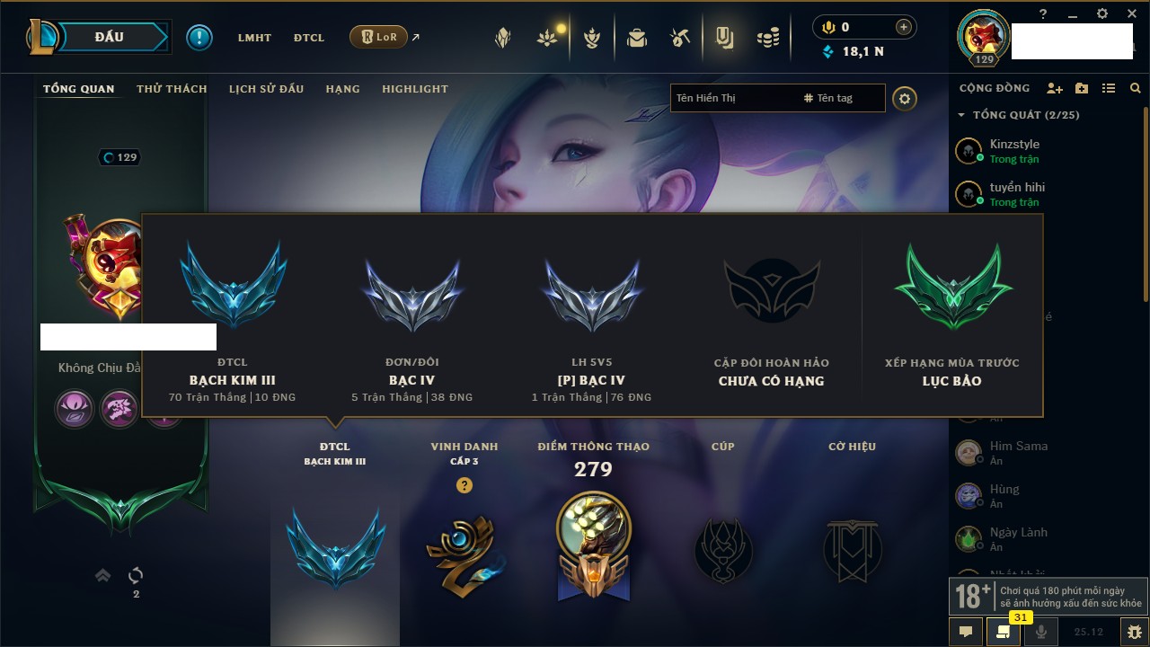Rank Đơn: Đồng IIKhung: Chưa có khungTướng: 170 - Còn 56487 THXTrang Phục: 90Rank ĐTCL: Chưa RankLinh Thú: 129