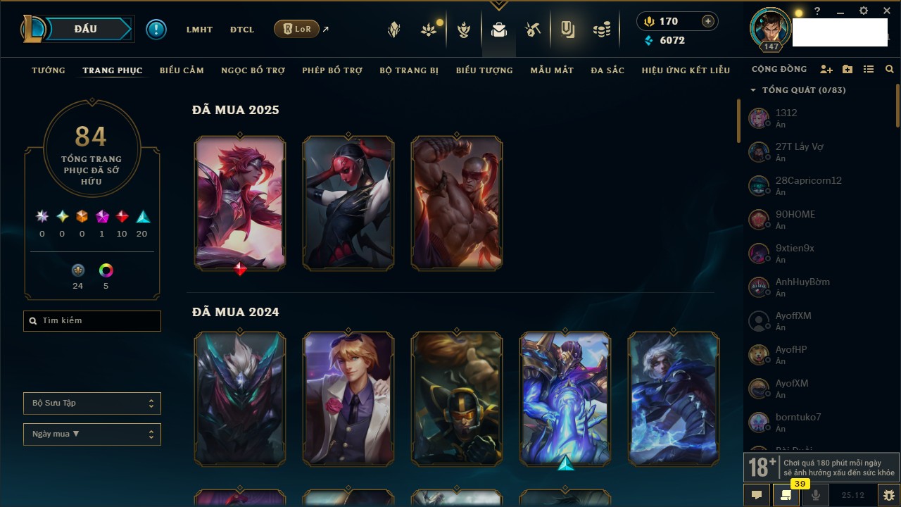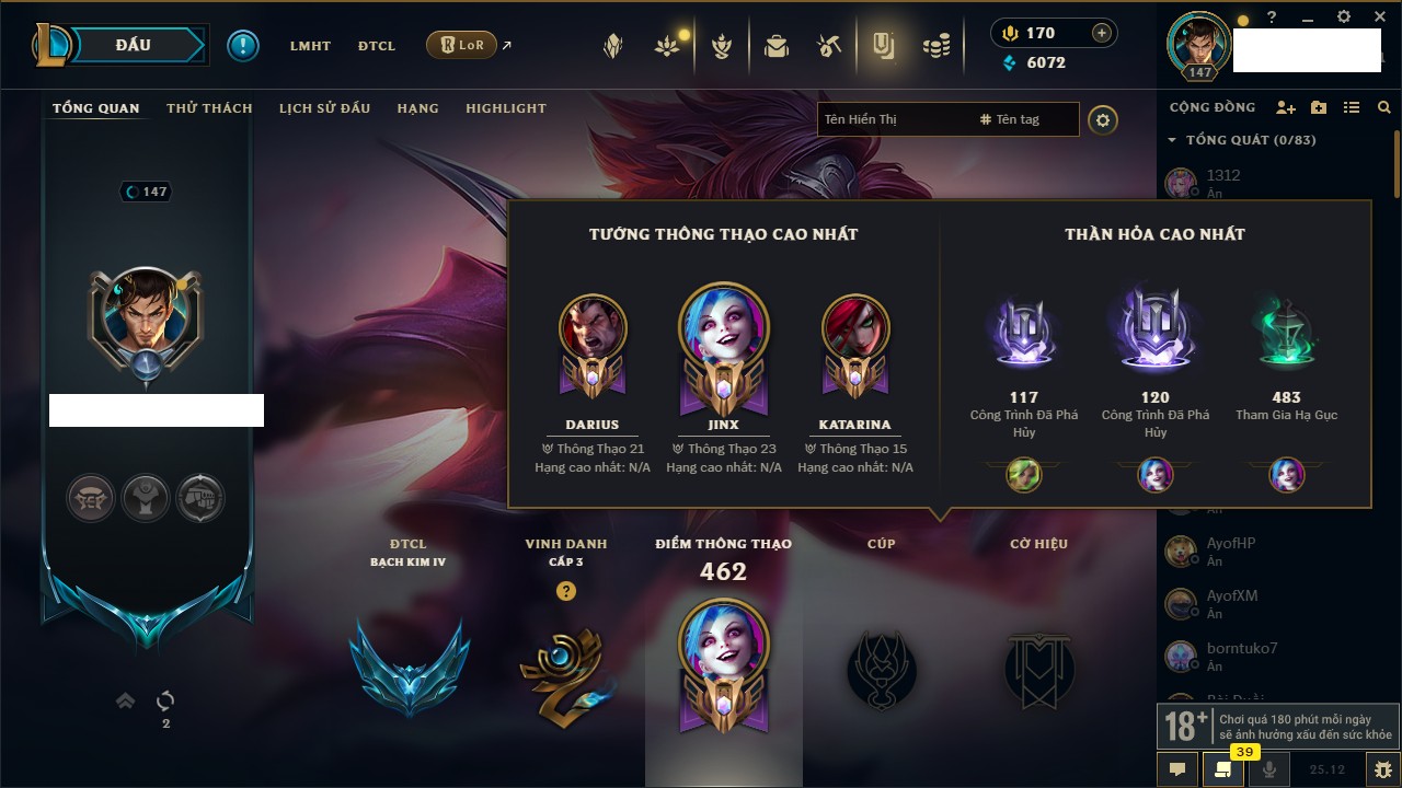 Rank Đơn: Bạch Kim IIKhung: Bạch kimTướng: 171 - Còn 316137 THXTrang Phục: 89Rank ĐTCL: Bạch Kim IIILinh Thú: 94