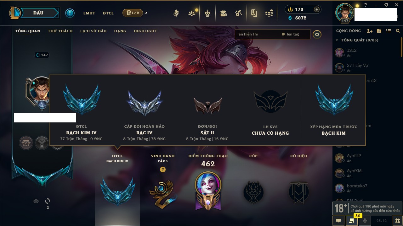Rank Đơn: Bạch Kim IIIKhung: Bạch kimTướng: 171 - Còn 136108 THXTrang Phục: 261Rank ĐTCL: Bạc IVLinh Thú: 73