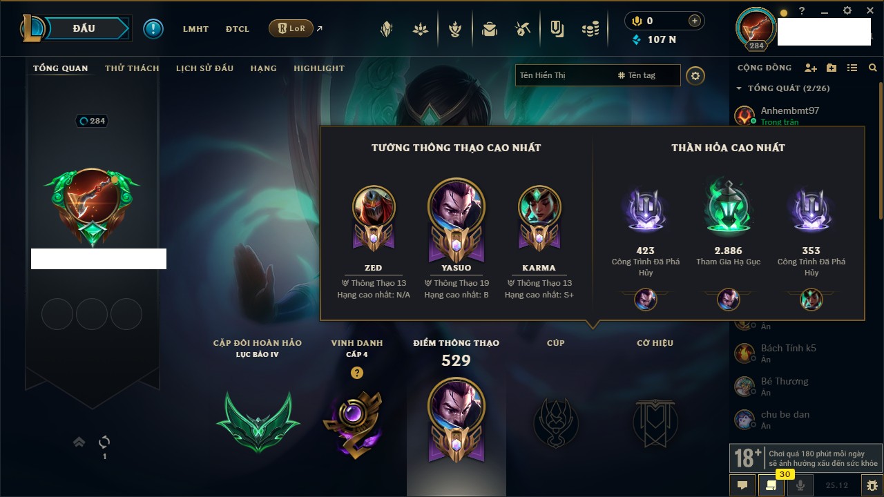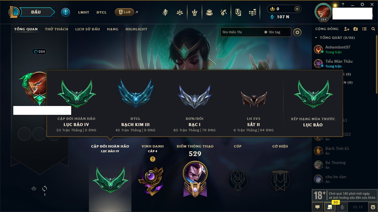 Rank Đơn: Lục Bảo IVKhung: Chưa có khungTướng: 171 - Còn 165973 THXTrang Phục: 160Rank ĐTCL: Chưa RankLinh Thú: 9