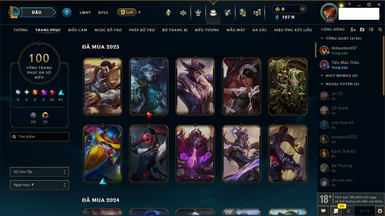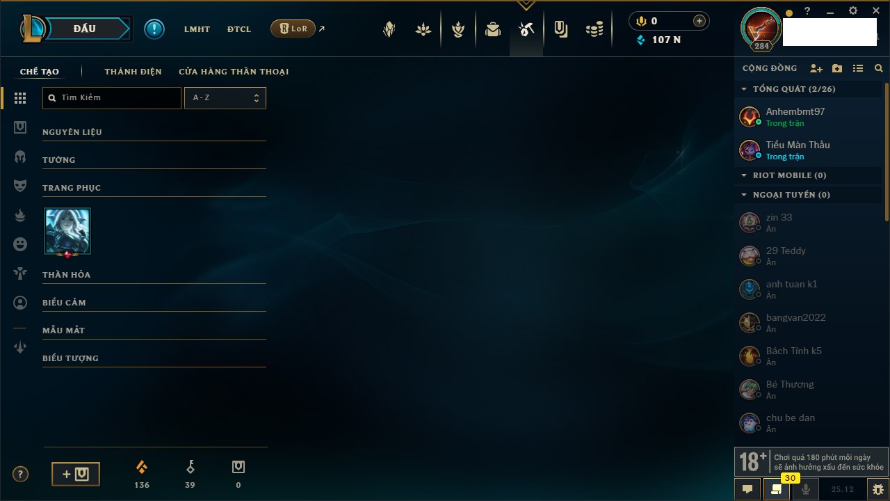 Rank Đơn: Vàng IIKhung: VàngTướng: 171 - Còn 34018 THXTrang Phục: 250Rank ĐTCL: Sắt IILinh Thú: 19