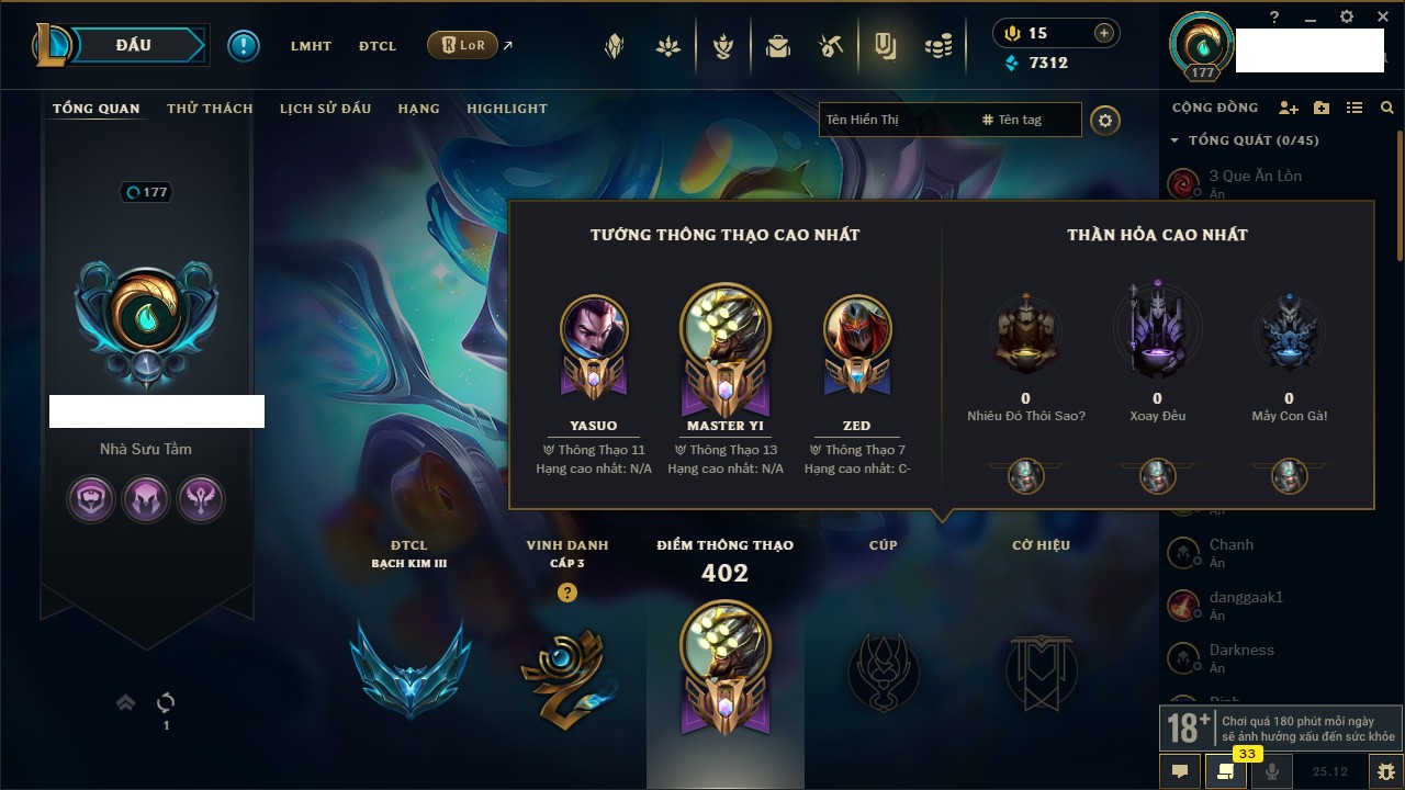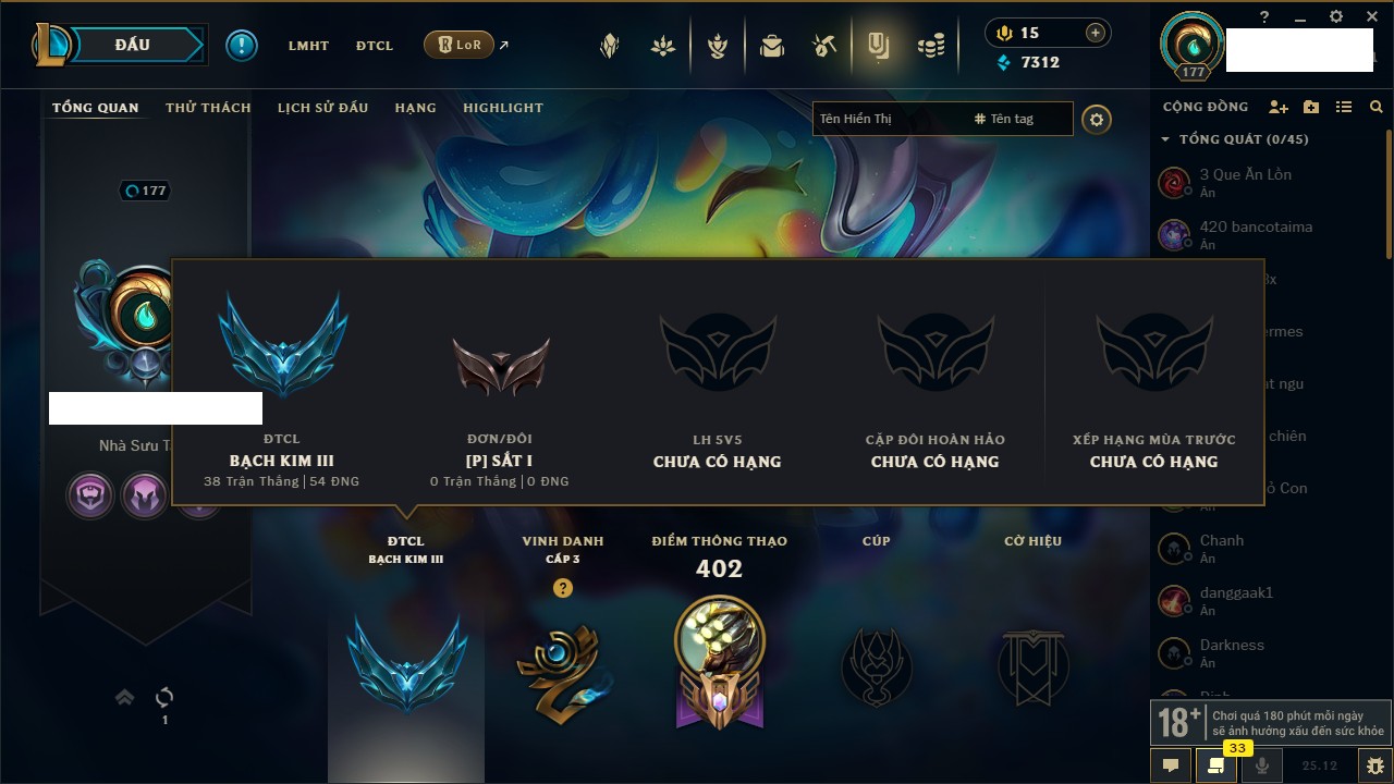 Rank Đơn: Lục Bảo IVKhung: Bạch kimTướng: 171 - Còn 128452 THXTrang Phục: 193Rank ĐTCL: Bạc IIILinh Thú: 100