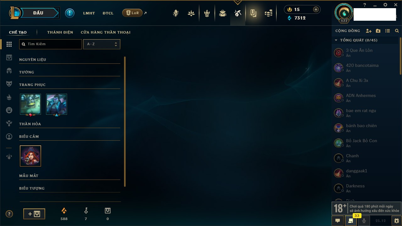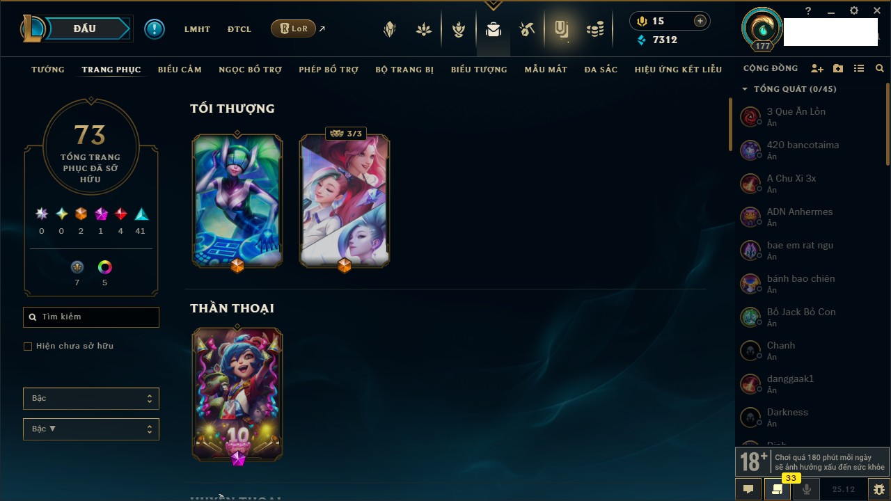 Rank Đơn: Vàng IIIKhung: BạcTướng: 171 - Còn 101359 THXTrang Phục: 88Rank ĐTCL: Kim Cương IVLinh Thú: 200