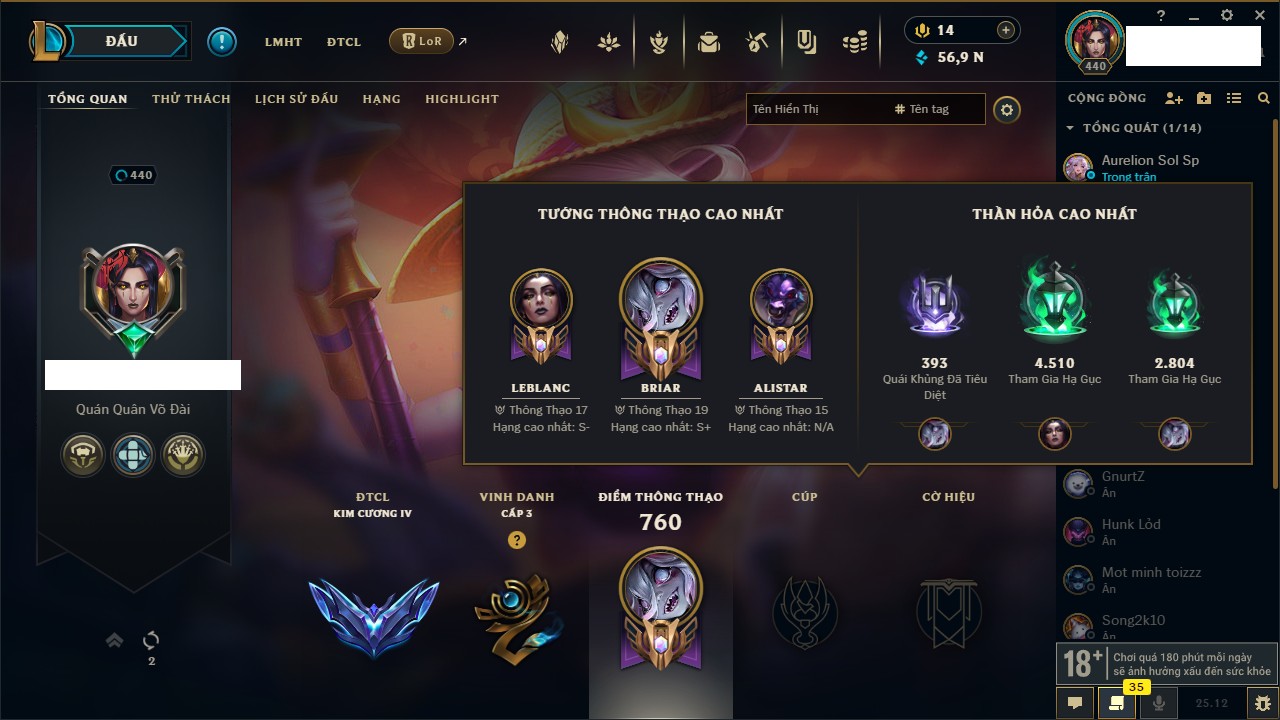 Rank Đơn: Bạch Kim IIKhung: Bạch kimTướng: 171 - Còn 316137 THXTrang Phục: 89Rank ĐTCL: Bạch Kim IIILinh Thú: 94