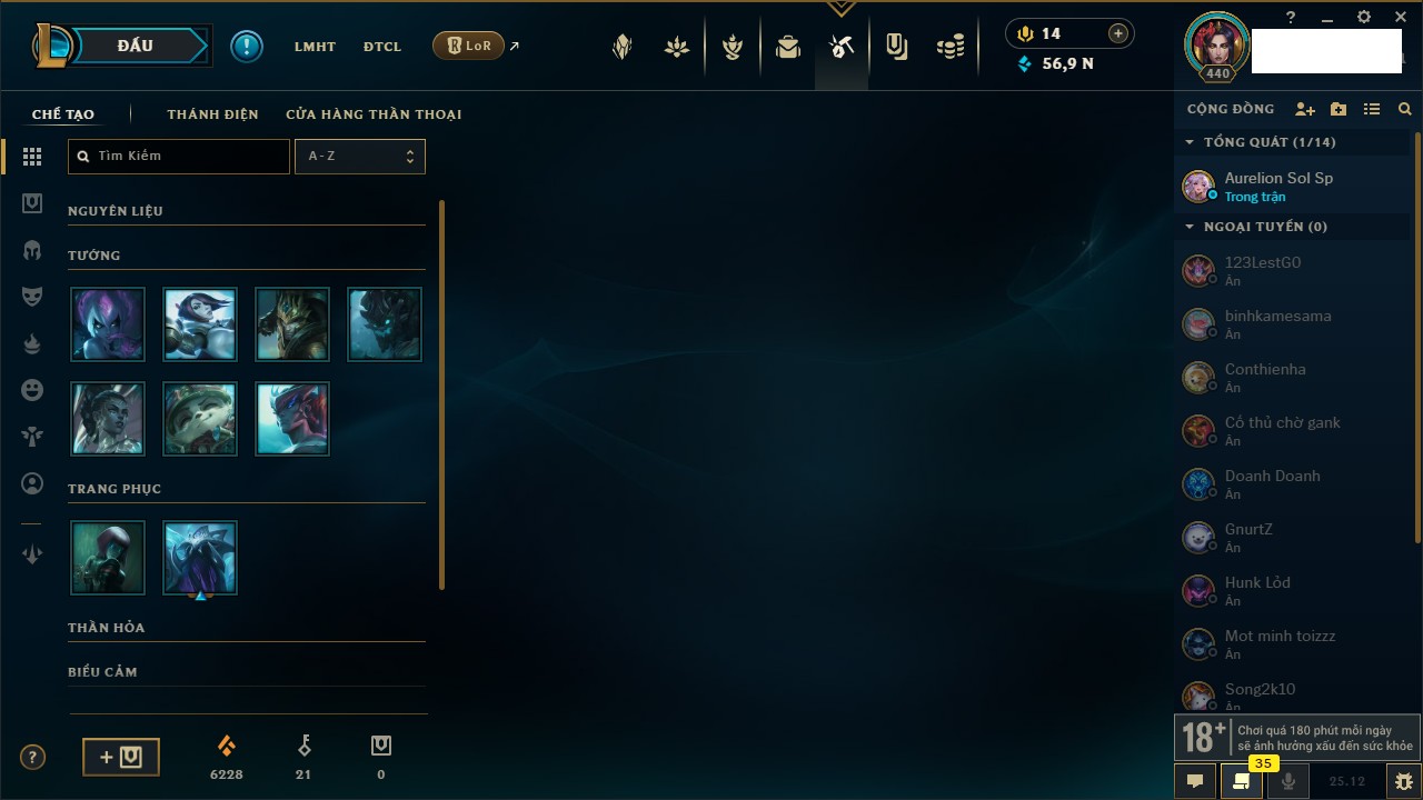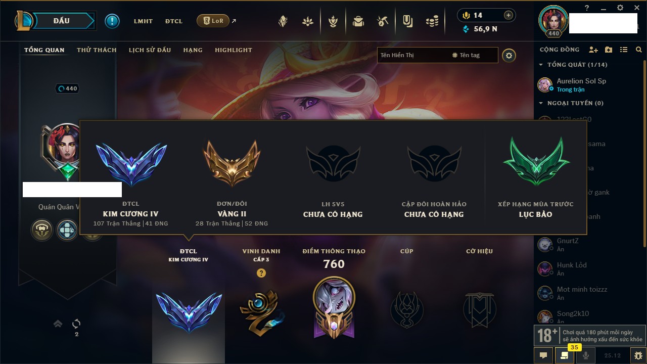 Rank Đơn: Lục Bảo IVKhung: VàngTướng: 171 - Còn 154648 THXTrang Phục: 203Rank ĐTCL: Bạch Kim IVLinh Thú: 69