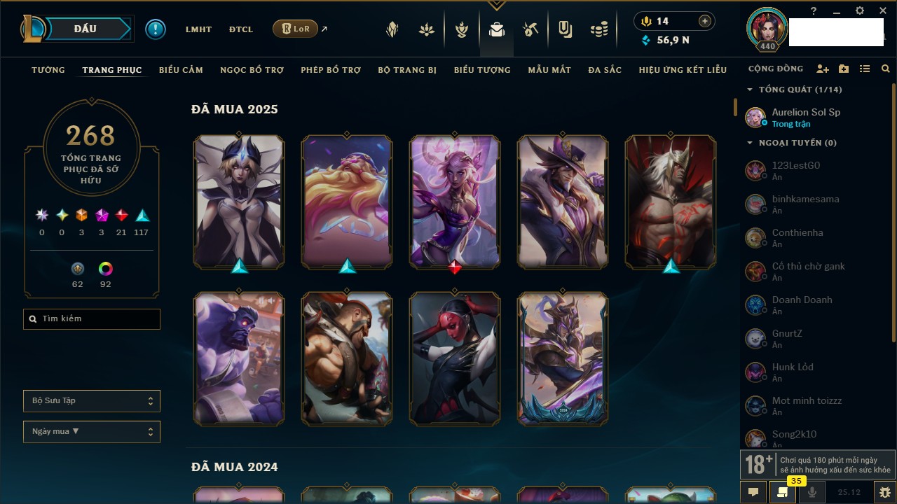 Rank Đơn: Vàng IIKhung: VàngTướng: 170 - Còn 243330 THXTrang Phục: 230Rank ĐTCL: Chưa RankLinh Thú: 68