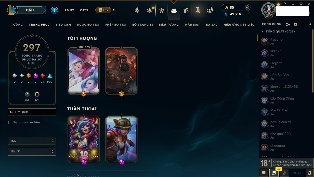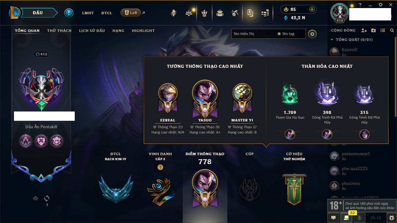 Rank Đơn: Chưa RankKhung: Chưa có khungTướng: 41 - Còn 11257 THXTrang Phục: 11Rank ĐTCL: Chưa RankLinh Thú: 84