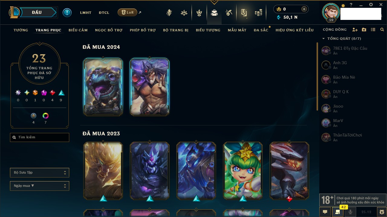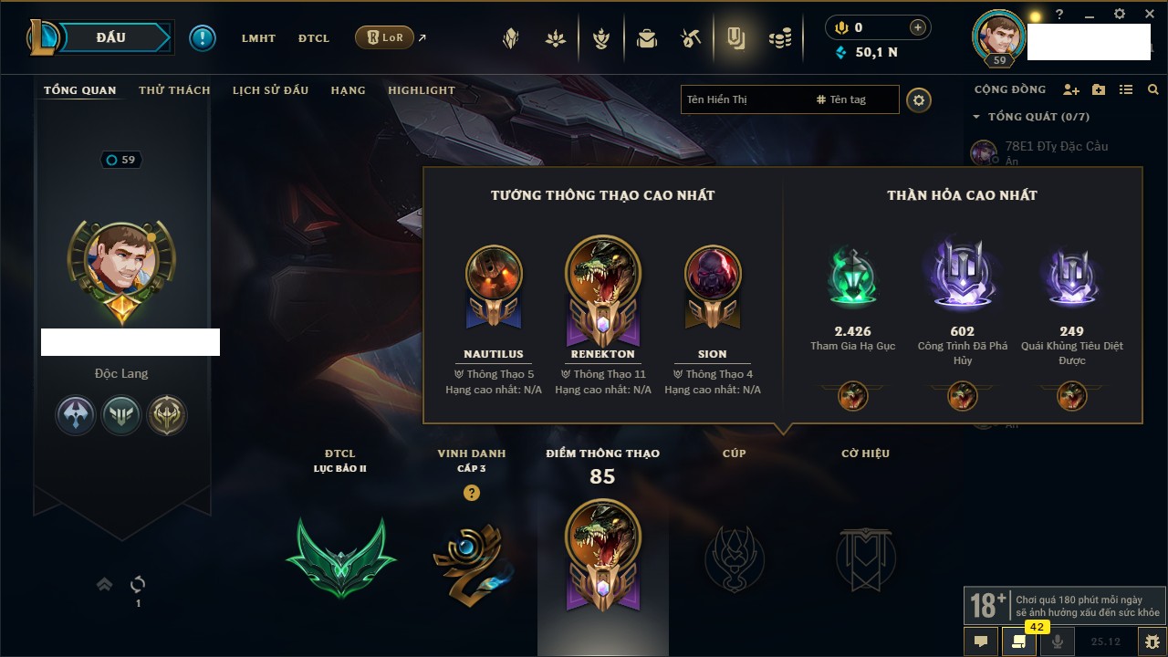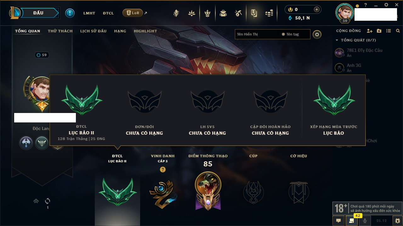 Rank Đơn: Chưa rank mùa nàoKhung: Chưa có khungTướng: 159 - Còn 50195 THXTrang Phục: 23Rank ĐTCL: Chưa rank mùa nàoLinh Thú: 70