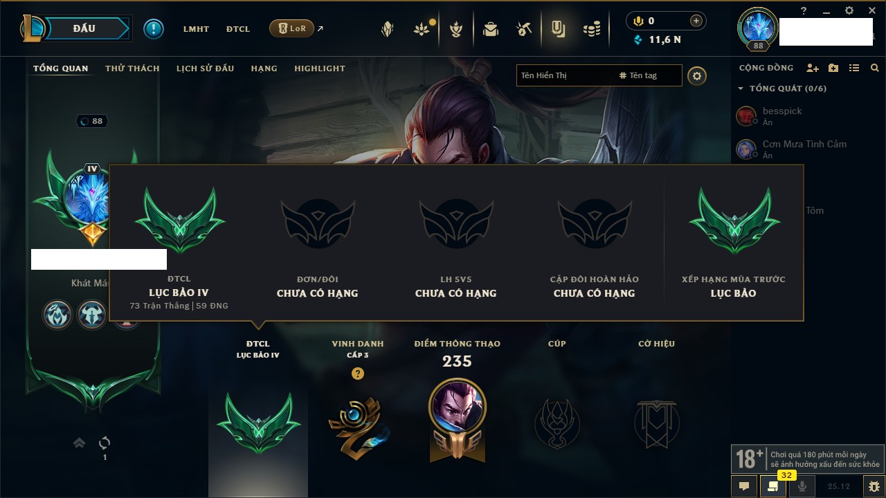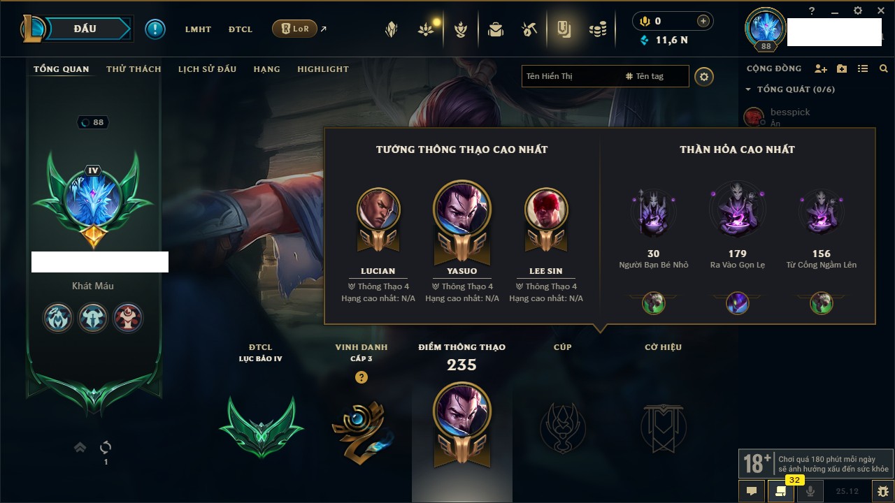 Rank Đơn: Đồng IVKhung: Chưa có khungTướng: 140 - Còn 10800 THXTrang Phục: 19Rank ĐTCL: Chưa RankLinh Thú: 119