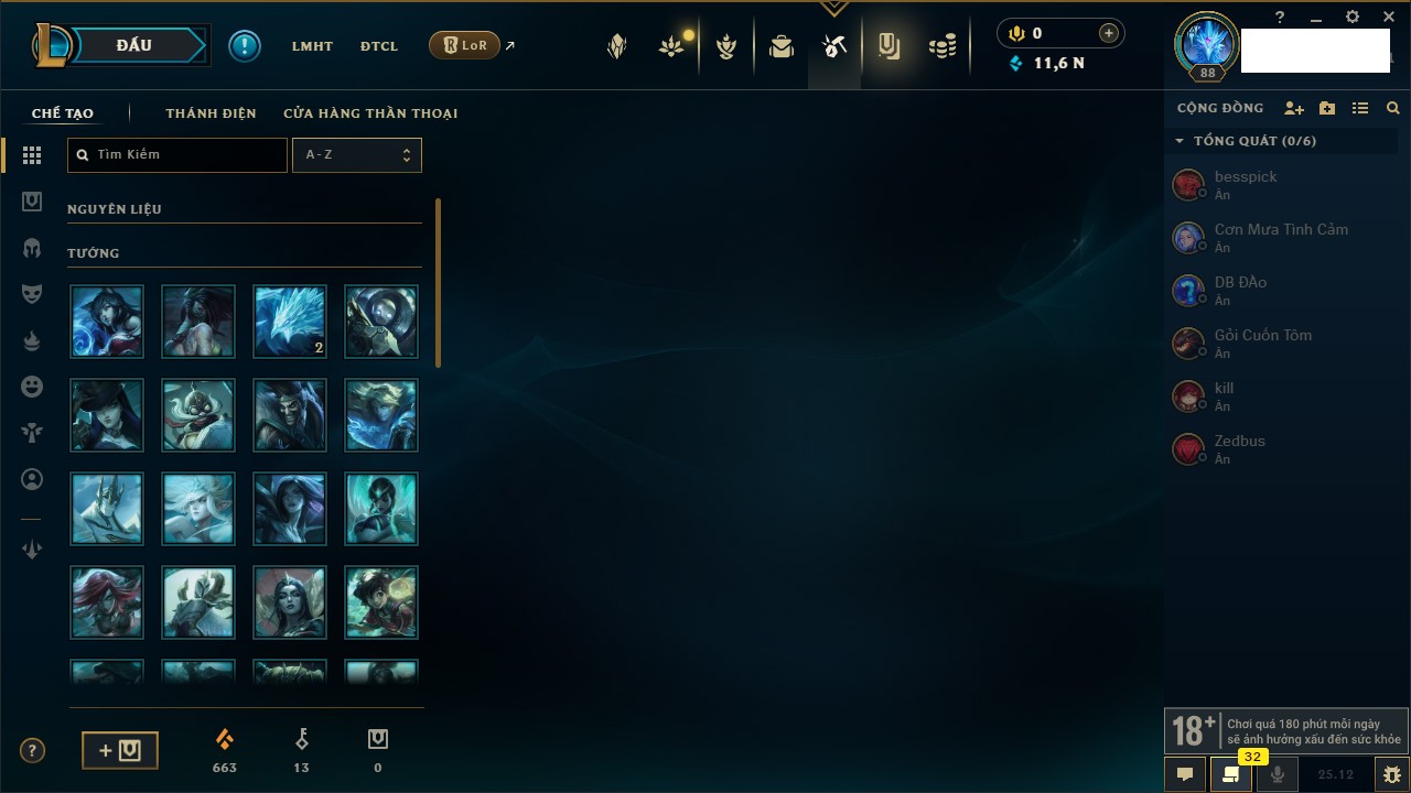 Rank Đơn: Đồng IKhung: Chưa có khungTướng: 171 - Còn 223932 THXTrang Phục: 61Rank ĐTCL: Lục Bảo ILinh Thú: 58