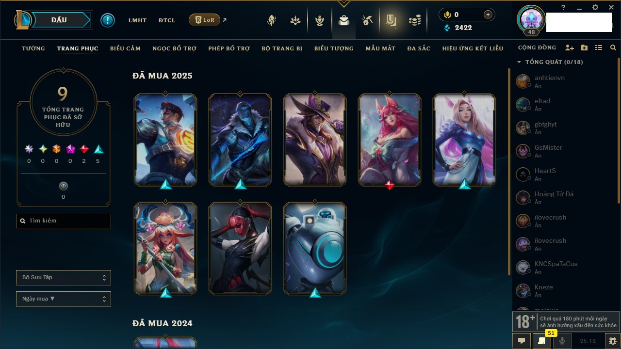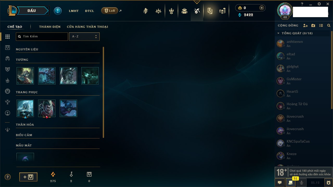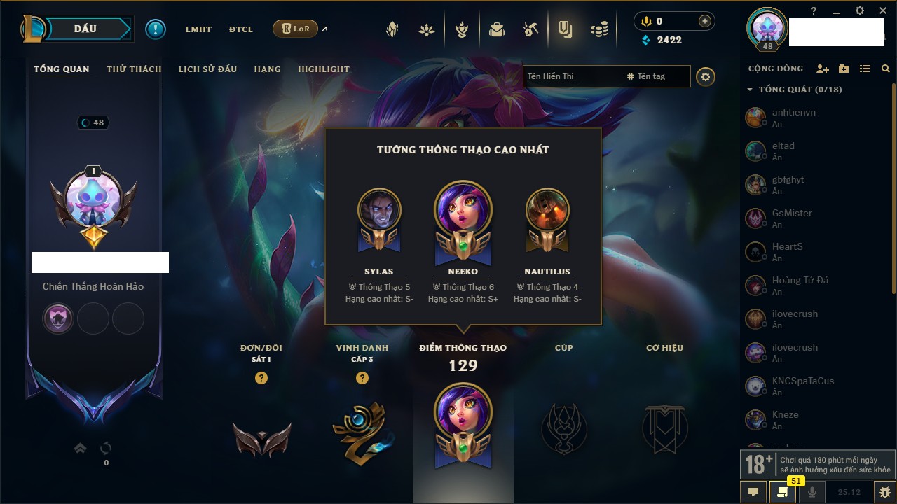 Rank Đơn: Bạc IIIKhung: BạcTướng: 171 - Còn 308470 THXTrang Phục: 164Rank ĐTCL: Chưa RankLinh Thú: 51