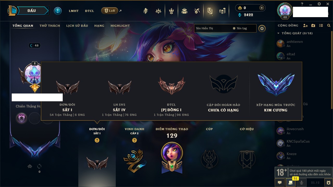 Rank Đơn: Vàng IKhung: Bạch kimTướng: 172 - Còn 108407 THXTrang Phục: 237Rank ĐTCL: Chưa RankLinh Thú: 44