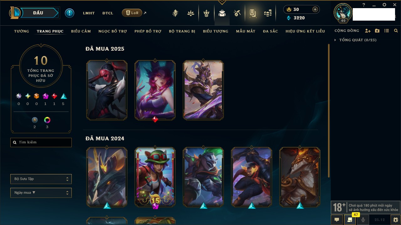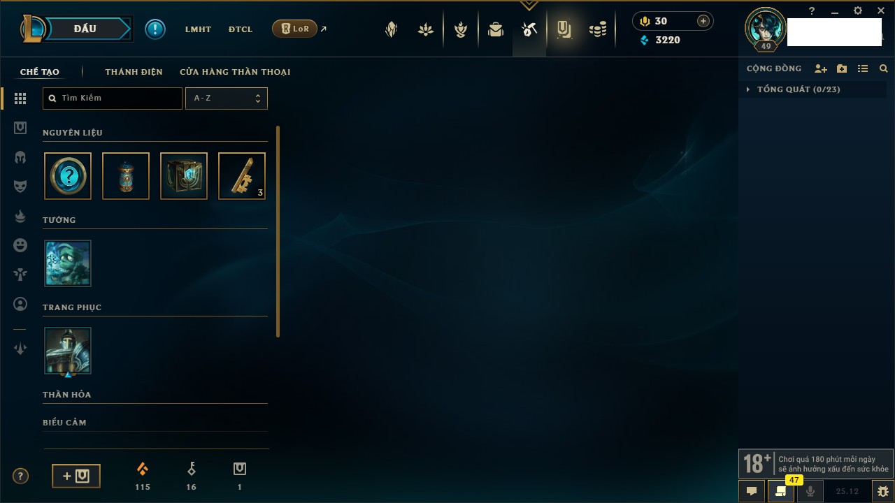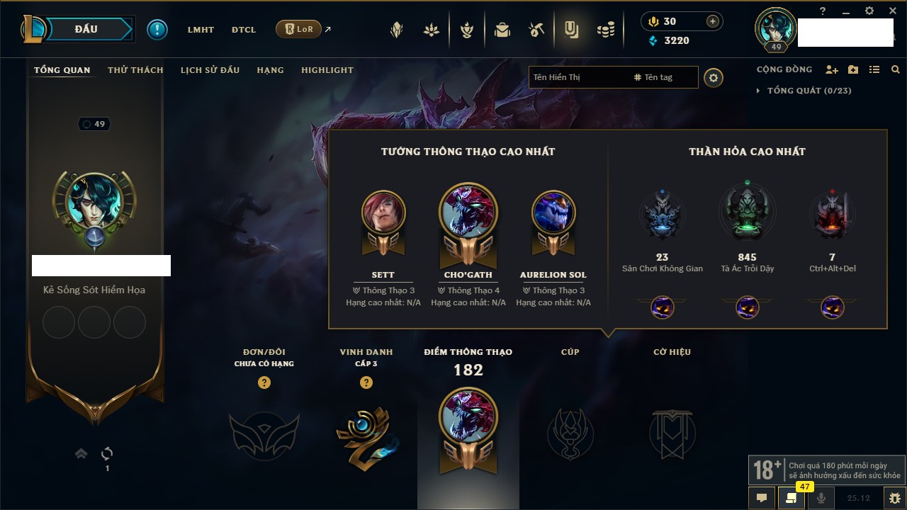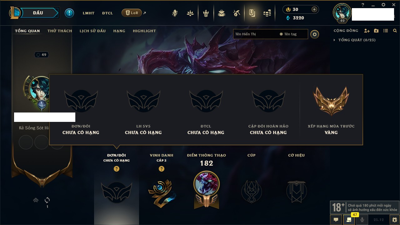 Rank Đơn: Chưa rank mùa nào Khung: Chưa có khung Tướng: 0 - Còn 3000 THX Trang Phục: 0 Rank ĐTCL: Đồng III Linh Thú: 38