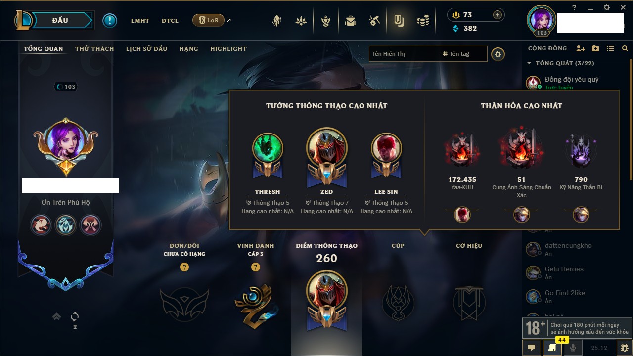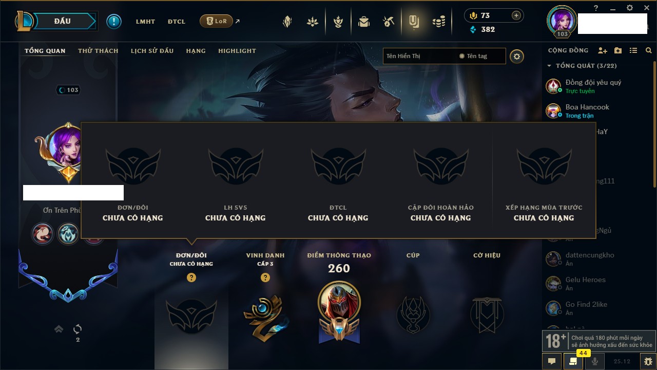Rank Đơn: Bạc IIIKhung: BạcTướng: 171 - Còn 190352 THXTrang Phục: 260Rank ĐTCL: Sắt IILinh Thú: 31