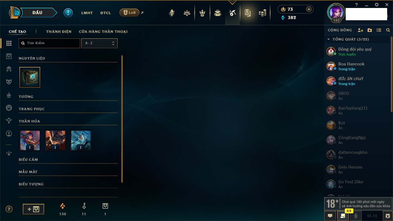 Rank Đơn: Lục Bảo IVKhung: VàngTướng: 171 - Còn 154648 THXTrang Phục: 203Rank ĐTCL: Bạch Kim IVLinh Thú: 69