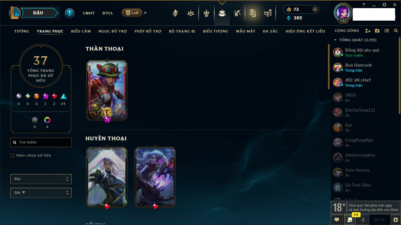Rank Đơn: Vàng IIIKhung: VàngTướng: 172 - Còn 164704 THXTrang Phục: 255Rank ĐTCL: Kim Cương IVLinh Thú: 156