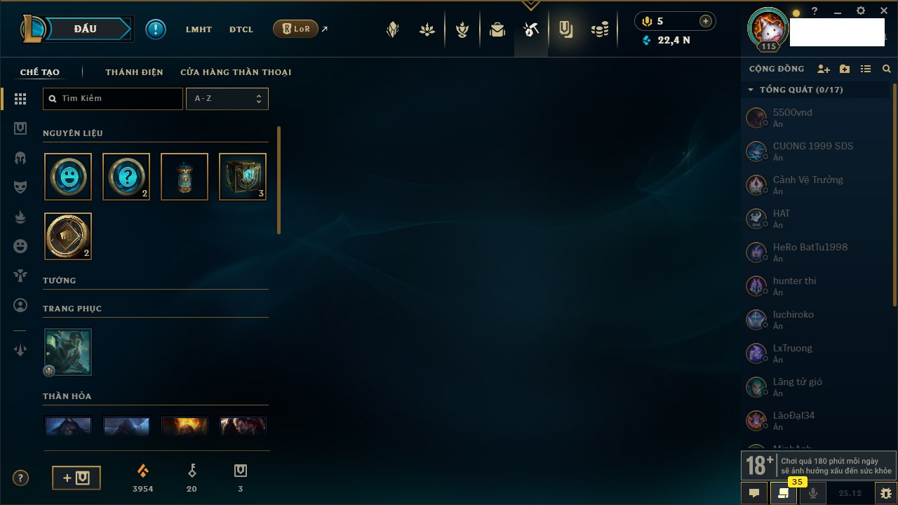 Rank Đơn: Vàng IKhung: BạcTướng: 171 - Còn 60584 THXTrang Phục: 286Rank ĐTCL: Vàng IIILinh Thú: 117
