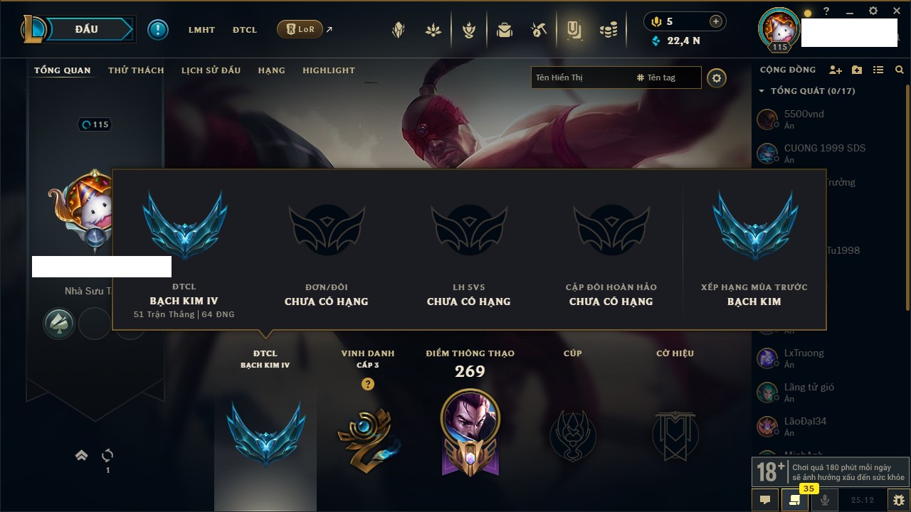 Rank Đơn: Bạch Kim IVKhung: Bạch kimTướng: 171 - Còn 54021 THXTrang Phục: 327Rank ĐTCL: Chưa RankLinh Thú: 115