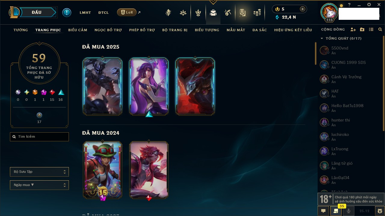 Rank Đơn: Vàng IIIKhung: VàngTướng: 171 - Còn 88128 THXTrang Phục: 329Rank ĐTCL: Chưa RankLinh Thú: 41